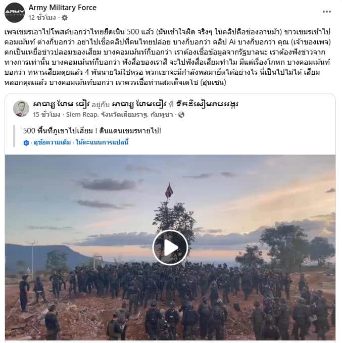 อย่างไรก็ตามเพจ Army Military Force ได้แชร์เฟซบุ๊กของชาวเขมรรายหนึ่งที่แชร์คลิปดังกล่าวออกไป พร้อมระบุข้อความว่า “เพจเขมรเอาไปโพสต์บอกว่าไทยยึดเนิน 500 แล้ว (มันเข้าใจผิด จริงๆ ในคลิปคือช่องอานม้า) ชาวเขมรเข้าไปคอมเมนท์ ต่างก็บอกว่า อย่าไปเชื่อคลิปที่คนไทยปล่อย บางก็บอกว่า คลิป Ai บางก็บอกว่า