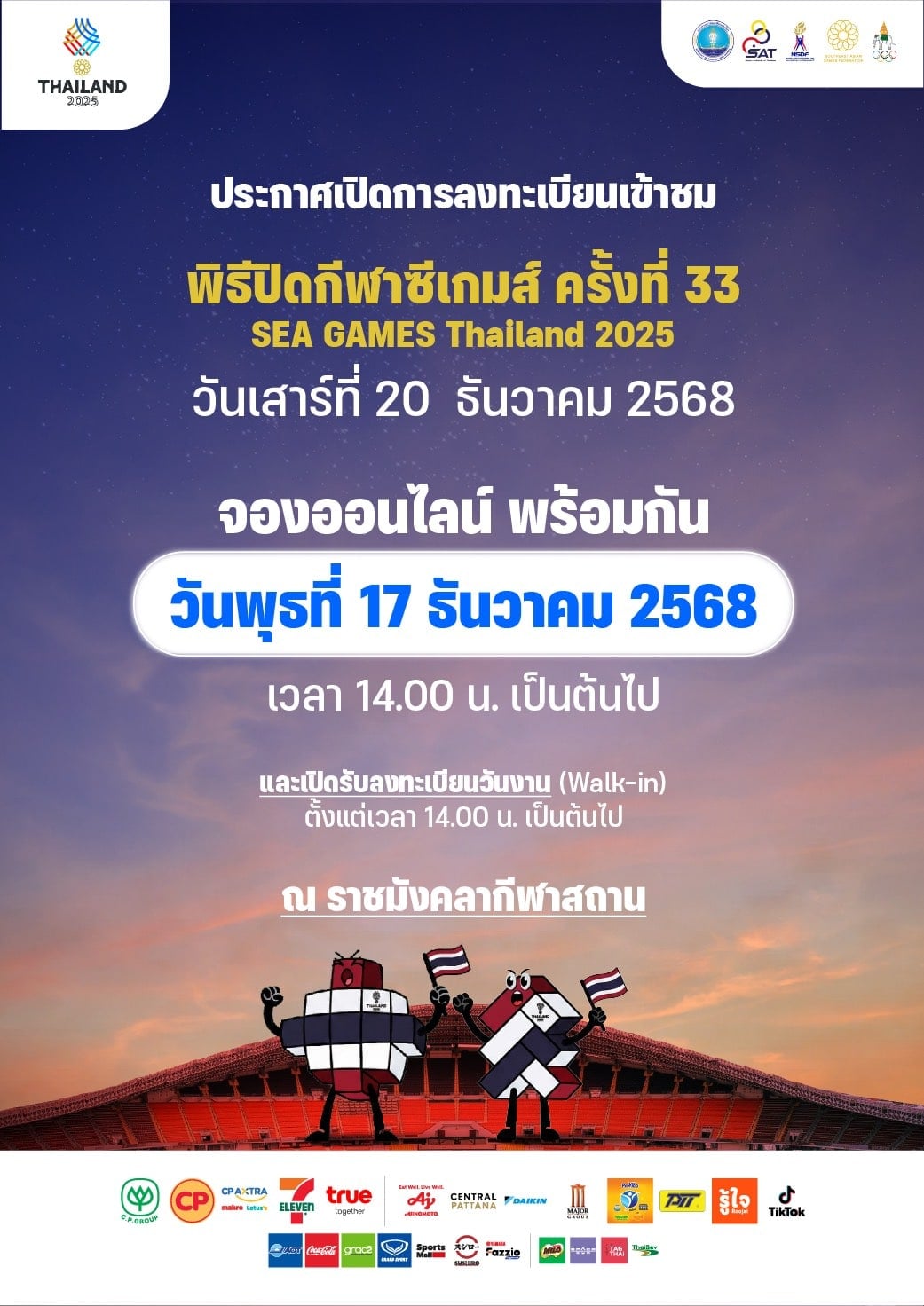 “ประกาศเปิดการลงทะเบียนเข้าชมพิธีปิดการแข่งขันกีฬาซีเกมส์ ครั้งที่ 33 (SEA GAMES Thailand 2025)”
