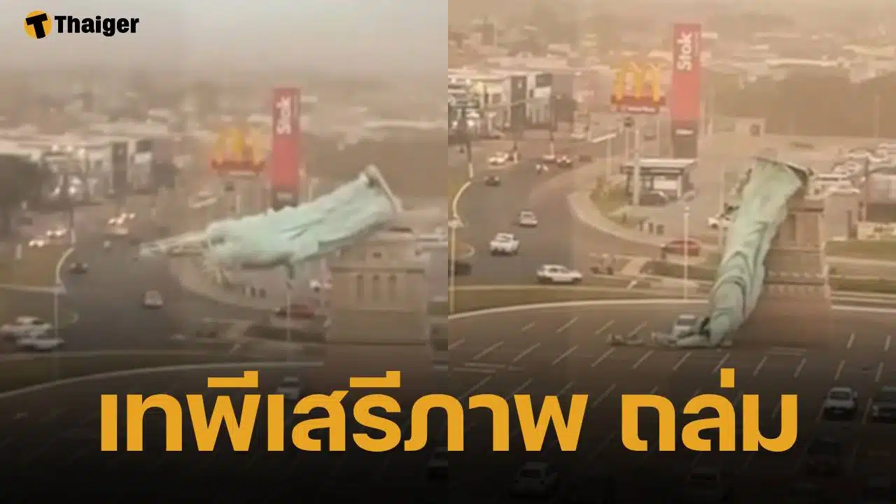 พายุซัด ‘เทพีเสรีภาพ’ สูง 35 เมตรถล่มกลางเมือง คลิปแชร์ว่อนนาทีร่วงกระแทกพื้น