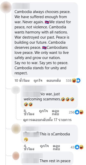 อย่างไรก็ตามก็มีชาวกัมพูชาเข้ามาโต้แย้ง เขียนบอกว่าประเทศกัมพูชาต้องการสันติภาพ และพยายามบ่ายเบี่ยงประเด็นกันเป็นจำนวนมาก ทั้งนี้โพสต์ดังกล่าวมีคนแสดงความเห็นแล้วเกือบ 5 พันคนนับเวลาที่รายงานฉบับนี้ถูกเผยแพร่