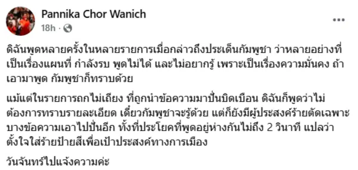 “แม้แต่ในรายการถกไม่เถียงที่ถูกนำข้อความมาปั่นบิดเบือน ดิฉันก็พูดว่าไม่ต้องการทราบรายละเอียด เดี๋ยวกัมพูชาจะรู้ด้วย แต่ก็ยังมีผู้ประสงค์ร้ายตัดเฉพาะบางข้อความเอาไปปั่นอีก ทั้งที่ประโยคที่พูดอยู่ห่างกันไม่ถึง 2 วินาที แปลว่าตั้งใจใส่ร้ายป้ายสีเพื่อเป้าประสงค์ทางการเมือง วันจันทร์ไปแจ้งความค่ะ”