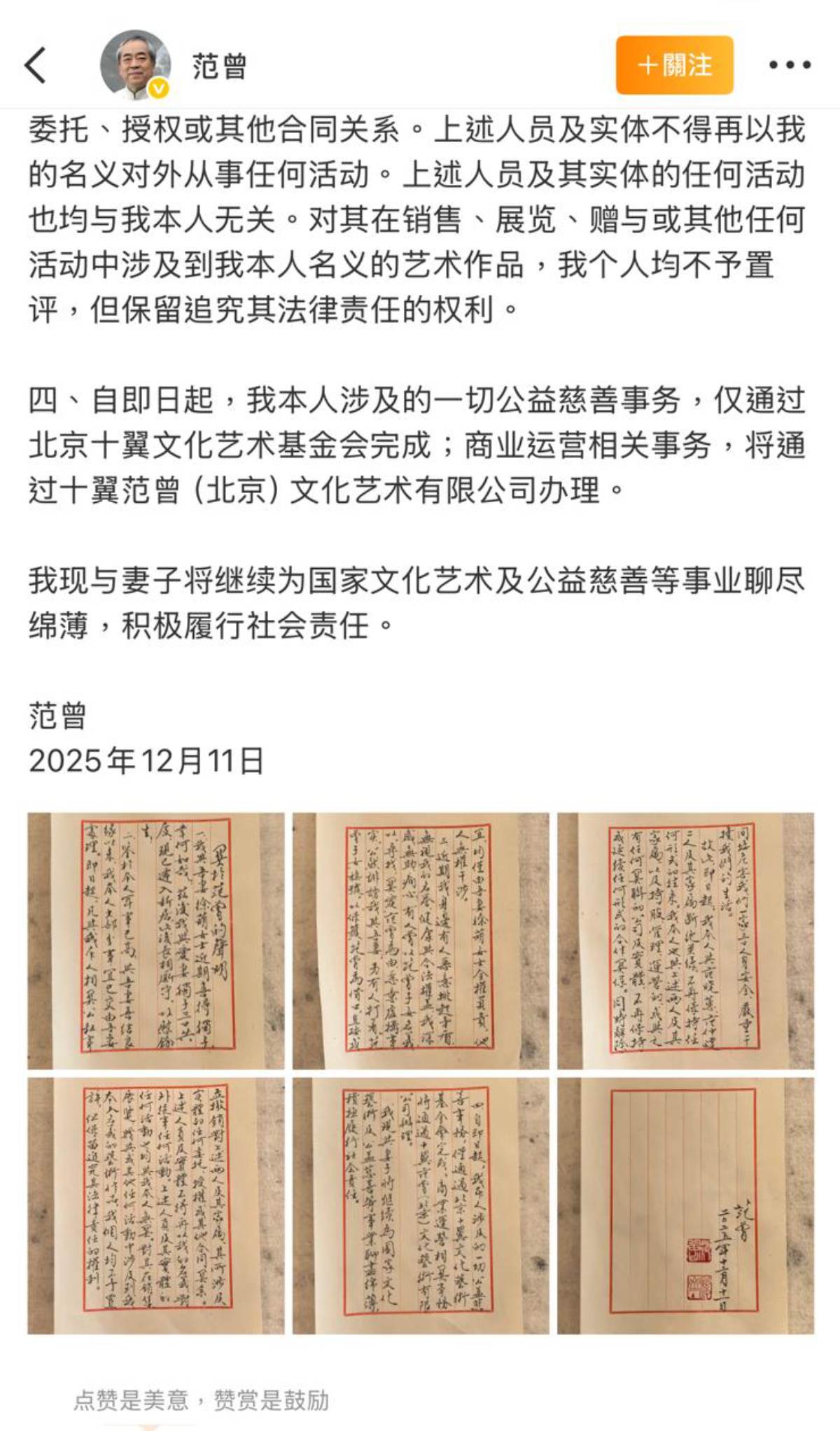ฟ่าน เจิง ศิลปินดังระดับตำนานประกาศมอบอำนาจให้ภรรยารุ่นหลานที่อายุห่างกัน 50 ปี ดูแลทรัพย์สินแต่เพียงผู้เดียว พร้อมตัดพ่อตัดลูกกับทายาทคนโตและลูกเลี้ยง หลังเกิดดราม่า ! กล่าวหาเรื่องยักยอกงานศิลปะและกักขังหน่วงเหนี่ยว