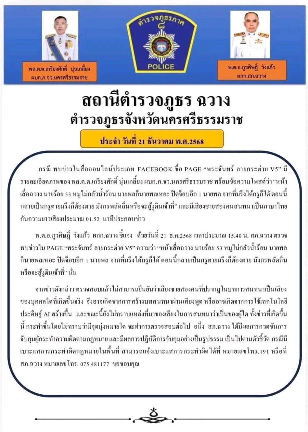 พ.ต.อ.ภูวศิษฐ์ วังแก้ว ผกก.สภ.ฉวาง ชี้แจงว่า ด้วยวันที่ 21 ธ.ค.2568 เวลาประมาณ 15.40 น. สภ.ฉวาง ตรวจพบข่าวใน PAGE “พระจันทร์ ลายกระต่าย V5” ความว่า “หน้าเสื่อฉวาง นายร้อย 53 หมูไม่กลัวน้ำร้อน นายพลก็นายพลเหอะ ปิดจ็อบ อีก 1 นายพล จากที่มรึงได้กรูก็ได้ ตอนนี้กลายเป็นกรูตายมรึงก็ต้องตาย มังกรพลัดถิ่น หรือจะสู้งูดินเจ้าที่” นั้น