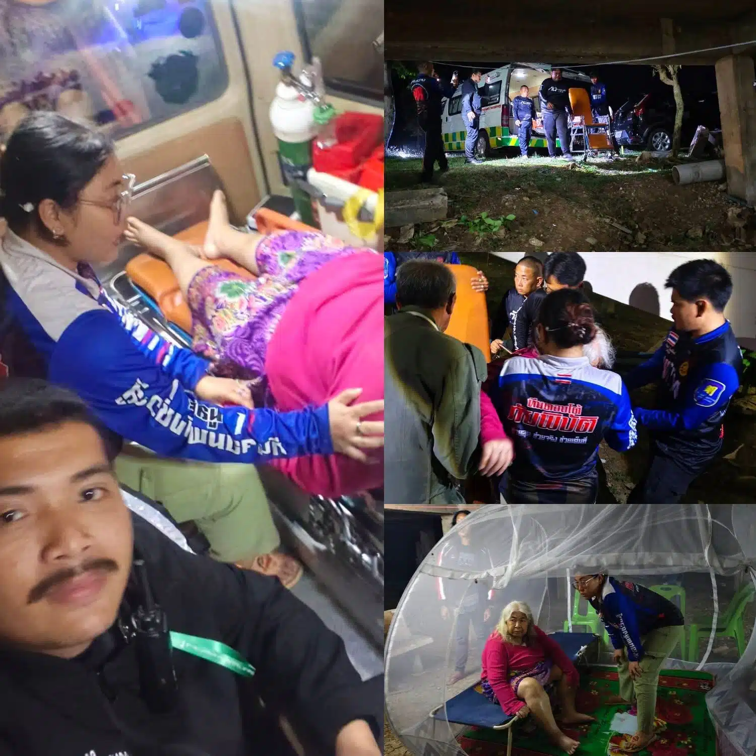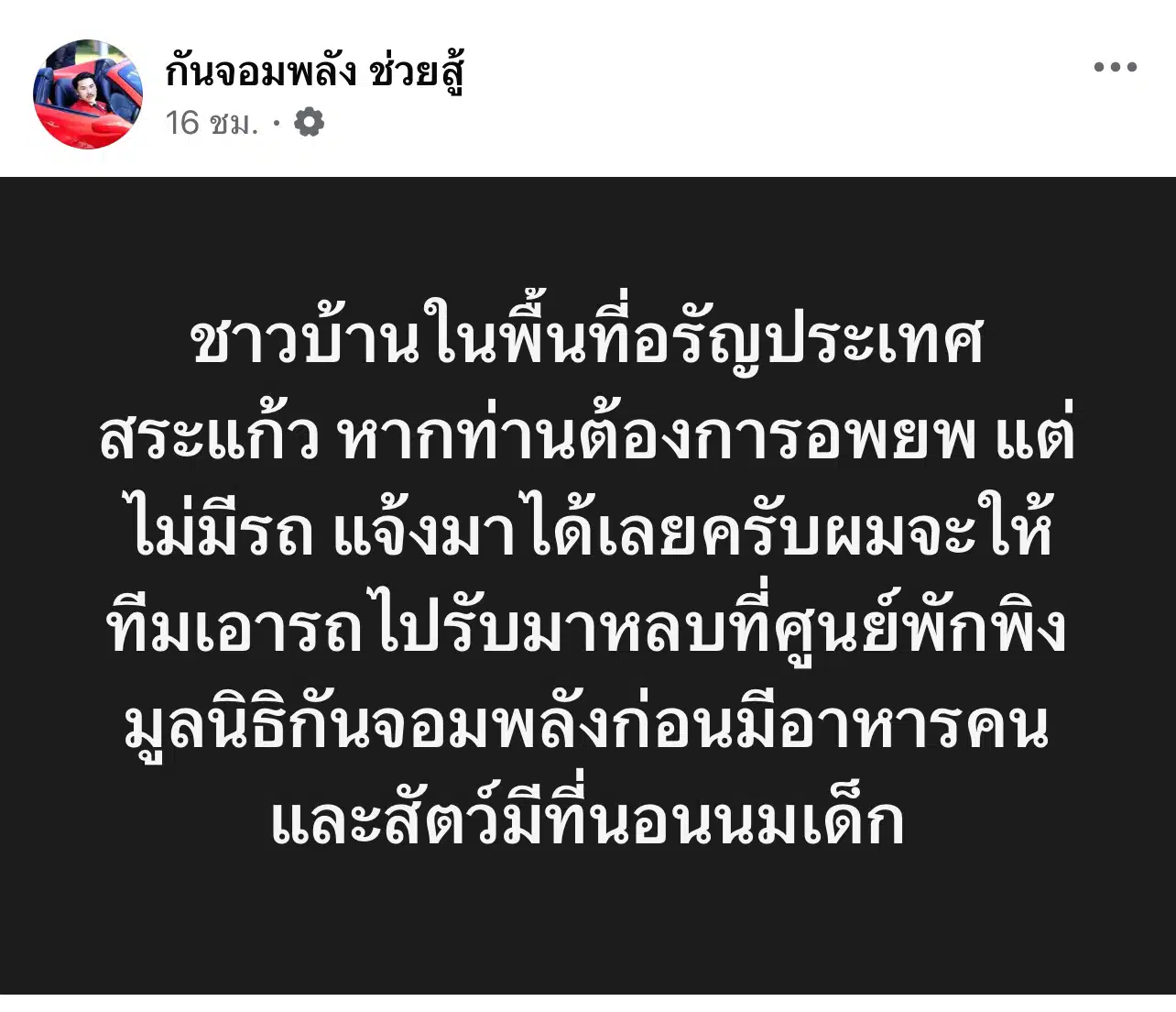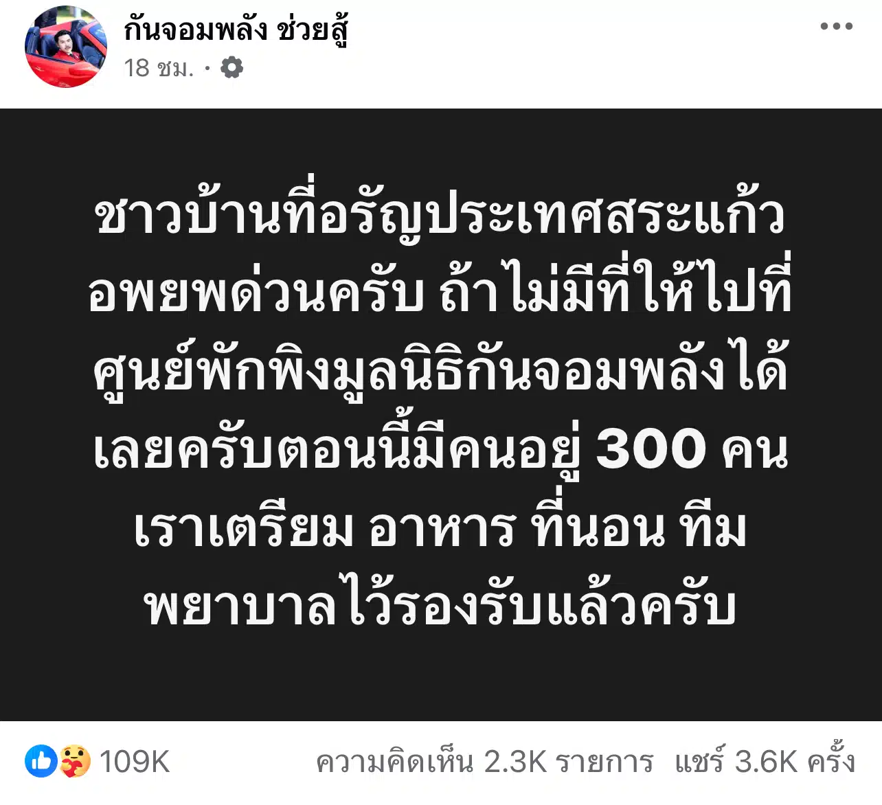 “น้องๆ ทีมงานมูลนิธิกันจอมพลังคืนนี้กำลังเร่งอพยพชาวบ้านที่อรัญประเทศออกจากพื้นที่ ตอนนี้น้องๆไปเจอคุณยายอายุ 72 เดินไม่ไหวมานอนกางมุ้งหลบภัยอยู่ที่ใต้ถุนวัด และพาคุณยายออกจากพื้นที่มาศูนย์อพยพมูลนิธิ กันจอมพลัง ช่วยสู้เรียบร้อยครับ”.