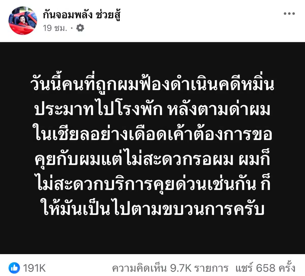 โดยวานนี้ (21 ธ.ค.) มีการเปิดเผยเนื้อหาบางส่วนที่มีการฟ้องร้องเอาผิดกับคู่กรณีในข้อหาหมิ่นประมาท ซึ่งกันจอมพลังเองระบุ คนที่ถูกตนฟ้องดำเนินคดีหมิ่นประมาทได้เดินทางไปรับทราบข้อกล่าวหาที่โรงพัก หลังตามด่าตนในเชียลอย่างเดือด และอีกฝ่ายต้องการขอคุยกับตน แต่ไม่สะดวกรอ ตนก็ไม่สะดวกบริการคุยด่วนเช่นกัน ก็ให้เป็นไปตามขบวนการ