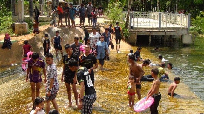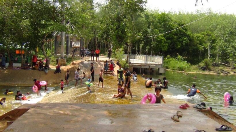 นักท่องเที่ยว พาครอบครัว เล่นน้ำที่ฝายน้ำล้น คลองหรูดหนองทะเล แถมได้เล่นไลเดอร์ฟรีที่เดียวในกระบี่