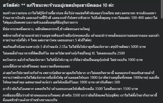 “กรณีแบบนี้ถือว่าเข้าข่ายหลอกลวงไหมคะ สำหรับ 3500 เราว่ามันก็ยังแพงไปอยู่ดีค่ะ เราไม่ได้ตั้งใจมากินราคานี้คือแค่หิวข้าวแล้วหาร้านข้างทางแวะกิน”