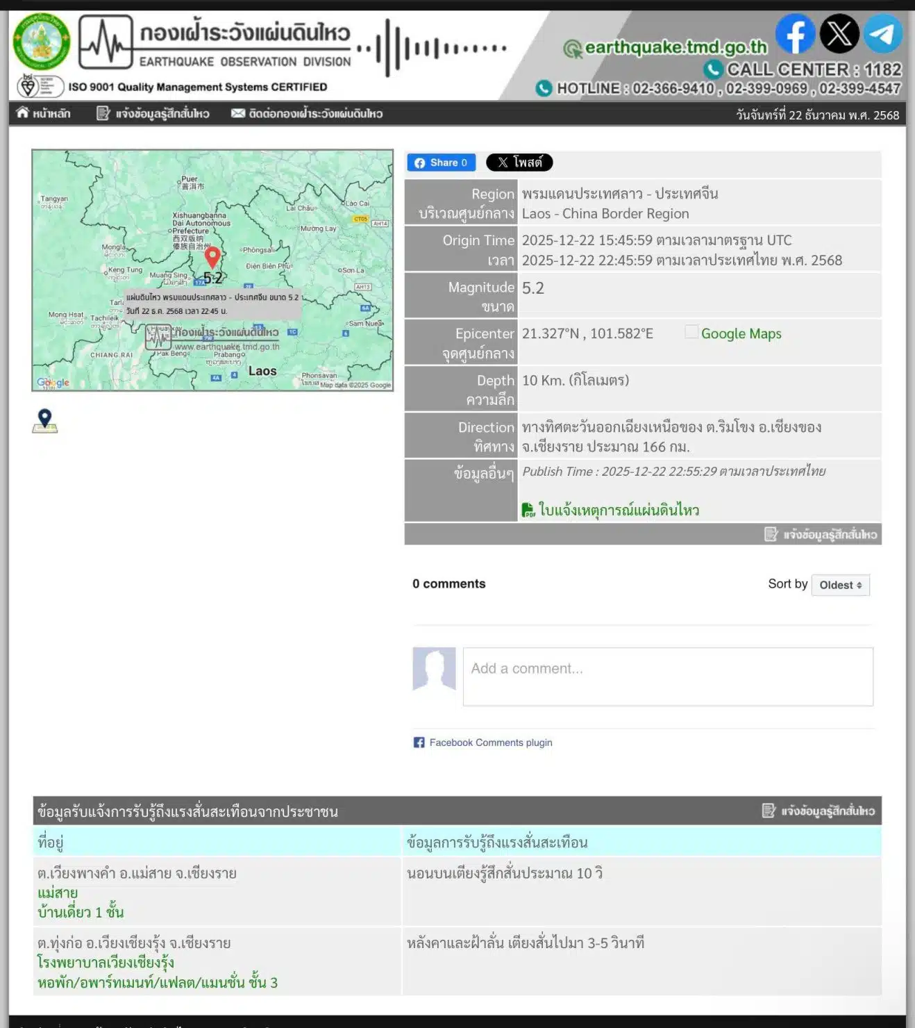 อ.แม่สาย (ต.เวียงพางคำ): ประชาชนในบ้านเดี่ยว 1 ชั้น รายงานว่าขณะนอนบนเตียงรู้สึกสั่นไหวประมาณ 10 วินาที