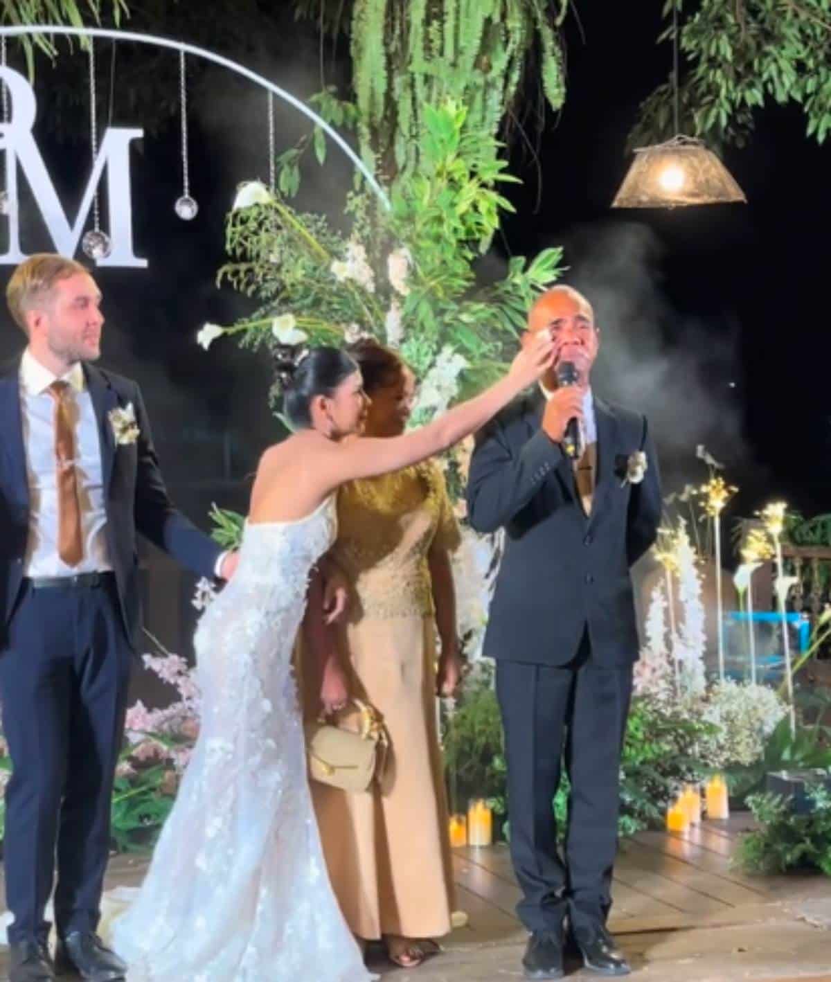 คุณพ่อทหารยังบอกอีกว่า งานแต่งลูกสาวมีเพียงครั้งเดียว ตนดีใจที่ได้มา น้ำตาลูกผู้ชายของทหาร ซึ่งไม่เคยร้องไห้ให้ใคร นี่เป็นครั้งแรก เพราะดีใจมากที่เห็นลูกเป็นฝั่งเป็นฝา ตนเลี้ยงลูกมาตั้งแต่ปี 39 เหมือนไข่ในหิน ดูแลเขามาอย่างใจเย็น แต่เมื่อเขามาเจอเนื้อคู่ ก็อยากฝากฝังให้เขาช่วยดูแล เพราะผมรักเขามาก (ดูคลิป).