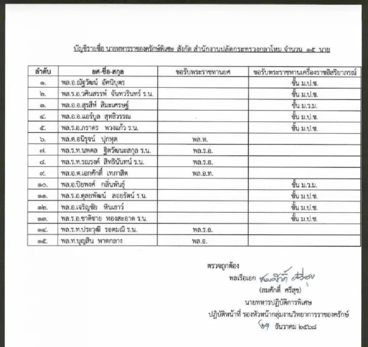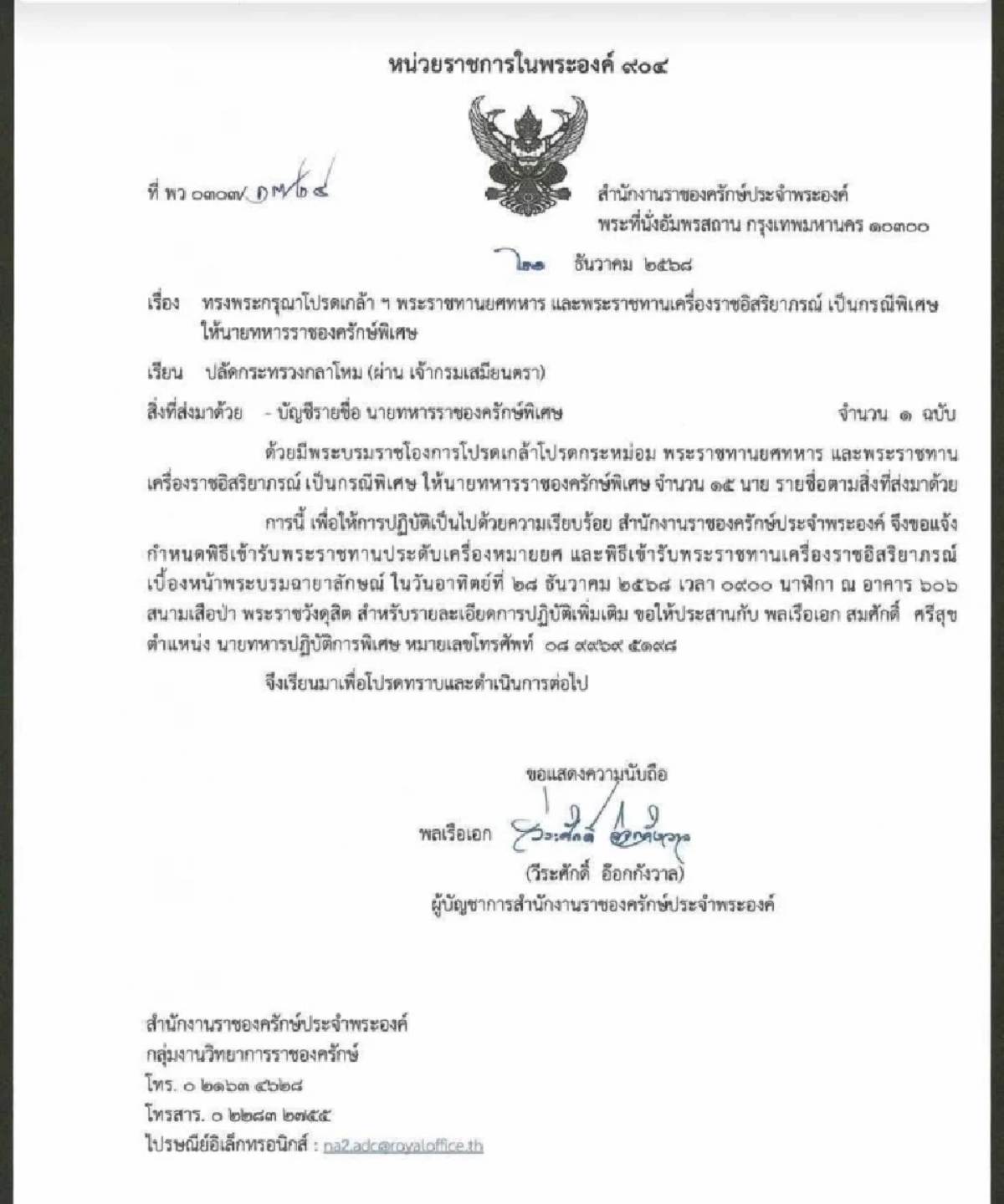 วันที่ 23 ธันวาคม 2568 พล.ร.อ.วีระศักดิ์ อ๊อกกังวาล ผู้บัญชาการสำนักราชองครักษ์ประจำพระองค์ ได้ทำหนังสือถึงปลัดกระทรวงกลาโหม (ผ่าน เจ้ากรมเสมียนตรา) ลงวันที่ 21 ธันวาคม 2568 แจ้งเรื่อง ทรงพระกรุณาโปรดเกล้าโปรดกระหม่อม พระราชทานยศทหาร และพระราชทานเครื่องราชอิสริยาภรณ์ เป็นกรณีพิเศษให้แก่นายทหารราชองครักษ์พิเศษ จำนวน 15 นาย