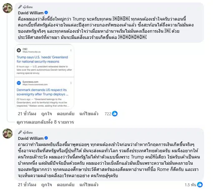 ครูเดวิด ระบุว่า ไม่อยากจะเชื่อเลย ล่าสุดทรัมป์ออกมายืนยันเมื่อไม่กี่ชั่วโมงที่แล้วว่าสหรัฐต้องการบุกกรีนแลนด์เพื่อความมั่นคงของประเทศ ผมมองว่าเป็นสัญญาณเตือนถึงสภาพของมหาอำนาจที่อยู่ในช่วงถดถอย