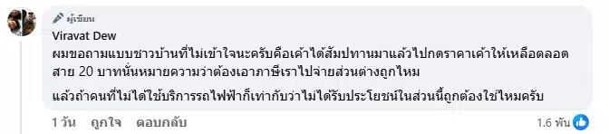 แต่ก็ได้มีชาวเน็ตส่วนหนึ่งแสดงความคิดเห็นว่า “ความเข้าใจที่ว่าคนที่ไม่ได้ใช้บริการก็ไม่ได้รับประโยชน์ แบบนี้ก็ไม่ถูกซะทีเดียวครับ รัฐเอาภาษีมาสร้างถนน มาอุดหนุนกองทุนน้ำมัน มาอุดหนุนรถยนต์ไฟฟ้า สร้างทางด่วน ฯลฯ คนใช้รถไฟฟ้า ก็ไม่ได้ประโยชน์จากสิ่งเหล่านี้เหมือนกันน่ะครับ