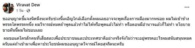 ผมขอแค่ใครสักคนที่เสียสละเพื่อประชาชนและประเทศชาติอย่างจริงจังไม่ว่าจะอยู่พรรคอะไรผมสนับสนุนหมดครับแต่ถ้าเข้ามาเพื่อหาประโยชน์ผมขออนุญาตวิจารณ์โดยสุจริตนะครับ”