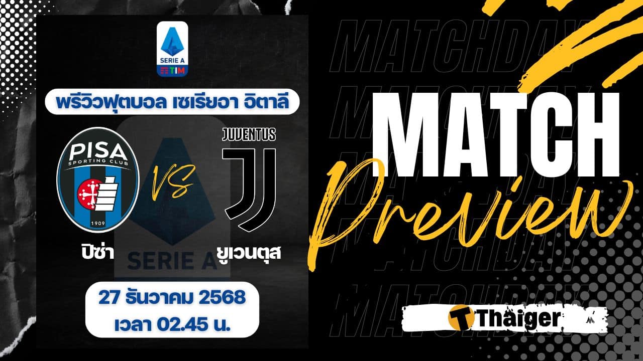 27 ธันวาคม 2568 เวลา 02.45 น. ถ่ายทอดสด ดูบอลสด ฟุตบอล กัลโช่ เซเรียอา อิตาลี ฤดูกาล 2025/26 ที่สนาม อาเรนา การิบาลดี ปิซ่า พบ ยูเวนตุส The Thaiger พาไปวิเคราะห์เกม พร้อมการทำนายผล และคาดการณ์ 11 ตัวจริงได้ที่นี่