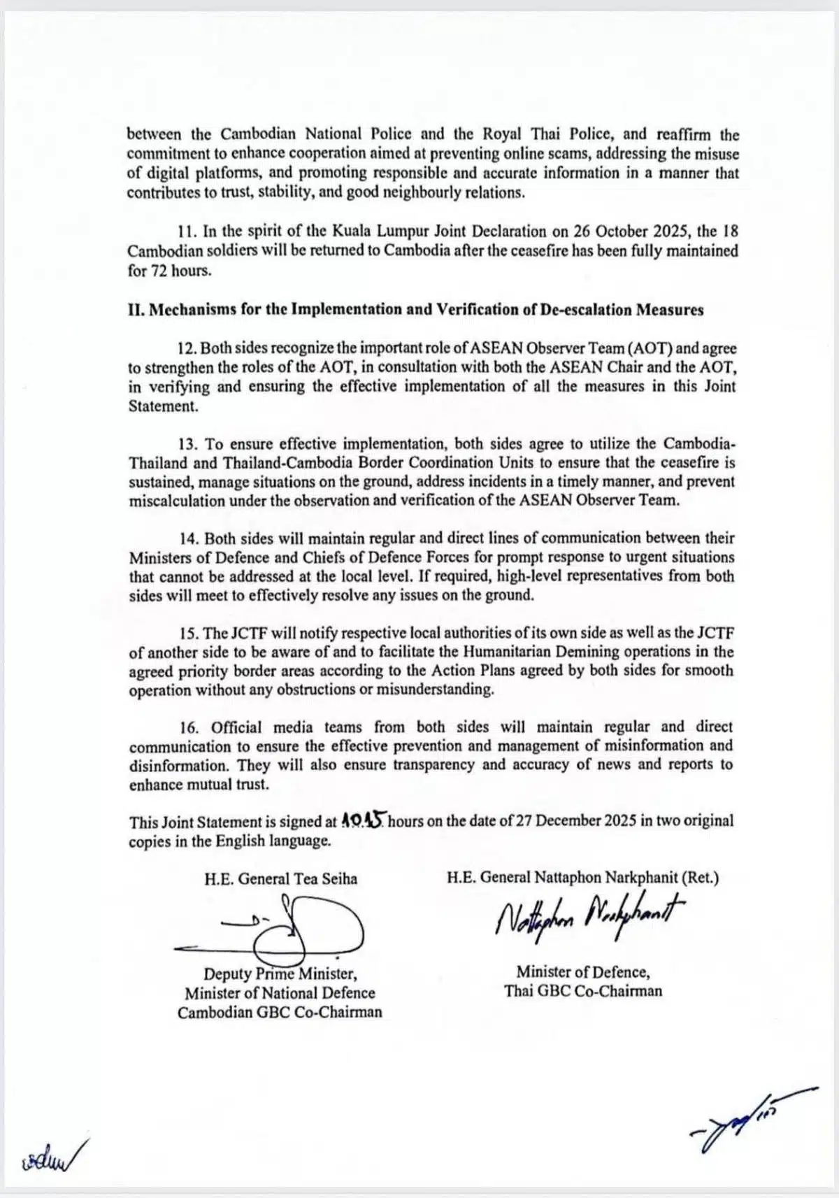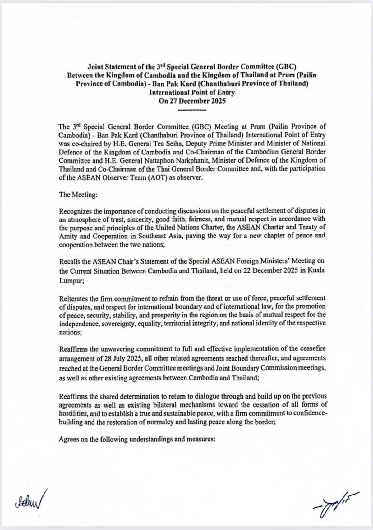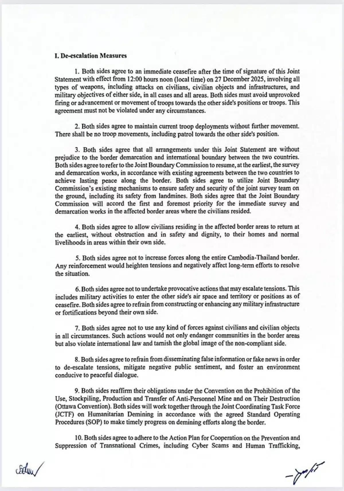 ทั้งนี้ เฟซบุ๊กแฟนเพจ “thaiarmedforce.com” รายงานสถานการณ์ไทย-กัมพูชา ลงนามในข้อตกลงหยุดยิงแล้ว โดยมีรายละเอียดดังนี้