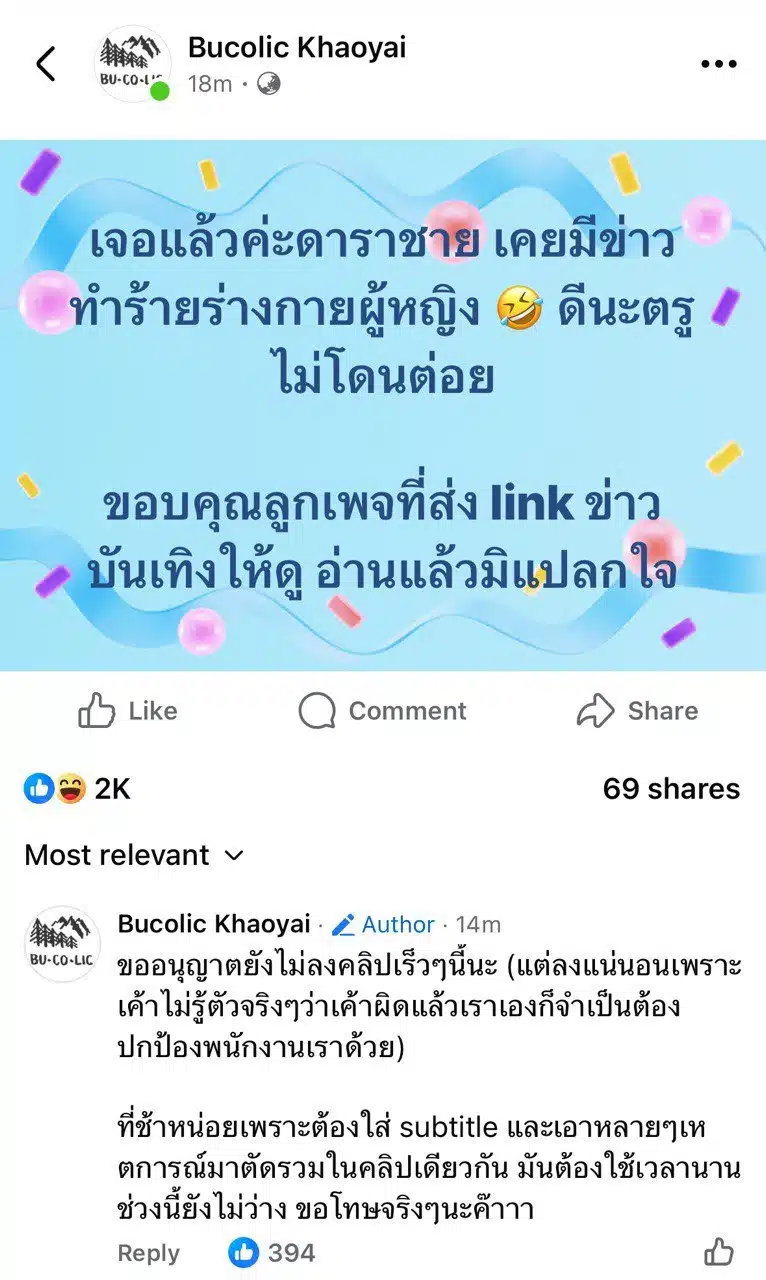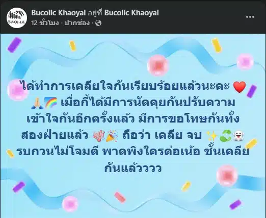 ทว่าล่าสุดวันนี้ (28 ธันวาคม) ทางร้าน Bucolic Khaoyai ได้โพสต์ในเพจเฟซบุ๊กโดยบอกว่า ได้มีการเคลียร์ใจกับคู่กรณีแล้ว และได้มีการนัดคุยปรับความเข้าใจกันอีกครั้งแล้ว และมีการขอโทษกันทั้งสองฝ่าย