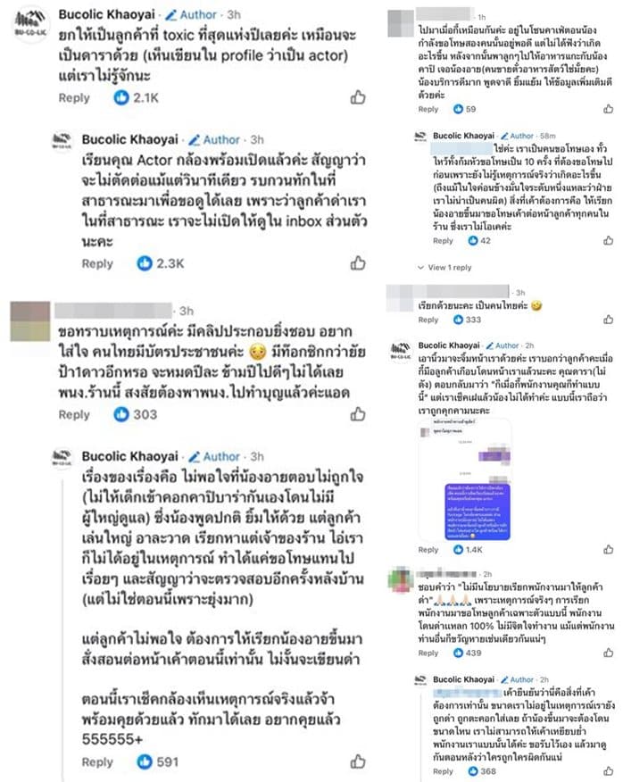 แต่กลายเป็นว่าลูกค้าดารารายนี้กลับโวยวายเรียกหาเจ้าของร้าน แม้เจ้าของร้านจะกล่าวขอโทษไปหลายครั้งเพื่อตัดปัญหา แต่อีกฝ่ายไม่ยอมจบ บังคับให้เรียกพนักงานคนดังกล่าวมา “กราบเท้า” หรือไหว้ขอโทษต่อหน้าคนทั้งร้าน ซึ่งเจ้าของร้านยืนยันว่าไม่มีนโยบายให้ลูกค้าด่าทอพนักงาน