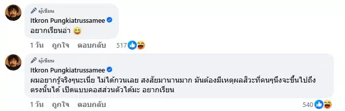 จ๋าย ไททศมิตร ยังได้ระบุข้อความในช่องคอมเมนต์ว่า “อยากเรียนอ่า ผมอยากรู้จริงๆ นะเนี่ย ไม่ได้กวนเลย สงสัยมานานมาก มันต้องมีเหตุผลสิวะที่คนๆ นึงจะขึ้นไปถึงตรงนั้นได้ เปิดแบบคอร์สส่วนตัวได้มะ อยากเรียน”