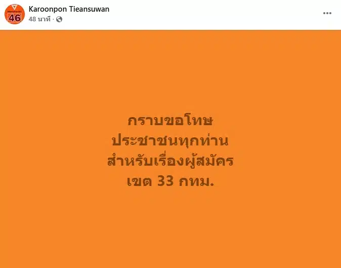 - พรรคส้ม ขอโทษหลังผู้สมัคร สส.กทม. โดนหมายจับ เร่งเปลี่ยนตัวผู้สมัคร