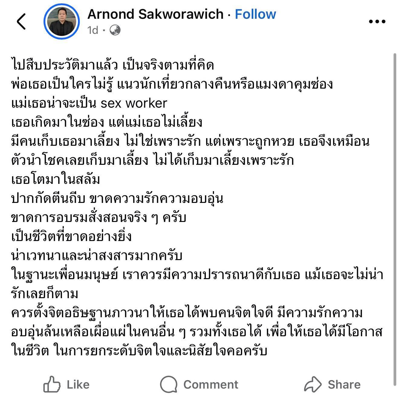 น.ส.รักชนก ศรีนอก หรือ ไอซ์ อดีต สส.กทม.พรรคประชาชน ได้โพสต์ข้อความเฟซบุ๊กฝากข้อความถึง รศ.ดร.อานนท์ อาจารย์ประจำคณะสถิติประยุกต์ สถาบันบัณฑิตพัฒนบริหารศาสตร์ ที่ได้เขียนข้อความาถึงพ่อแม่ของ สส.ไอซ์ โดยระบุว่า “แม่เธอน่าจะเป็น sex worker”