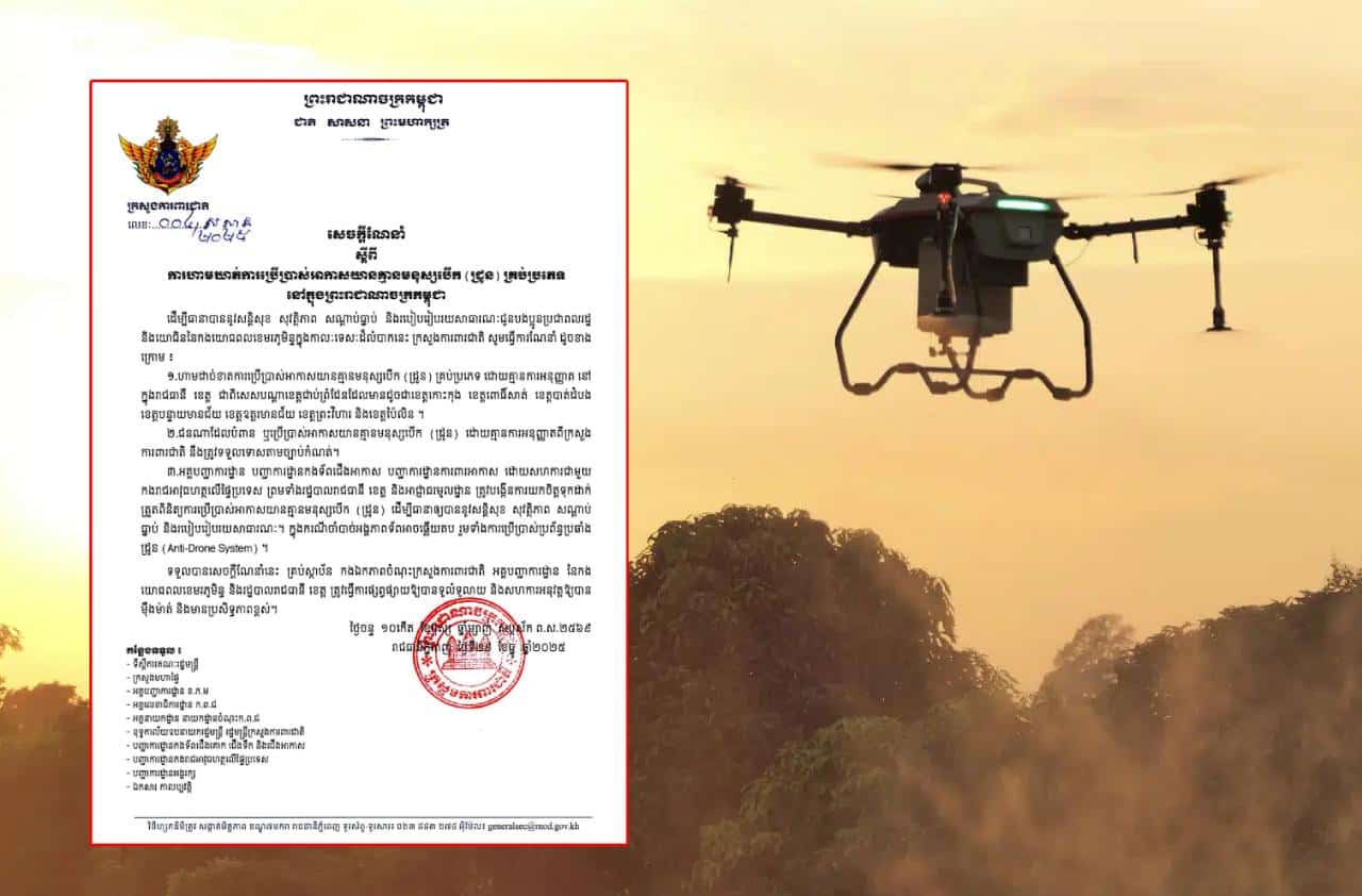 กระทรวงกลาโหมของกัมพูชา ได้โพสต์ข้อความเฟซบุ๊กเผยแพร่เอกสารสั่งห้ามบินโดรน พร้อมข้อความที่เขียนว่า “คำแนะนำว่าด้วยการเพิ่มความเข้มงวดและการห้ามใช้อากาศยานไร้คนขับ (โดรน) โดยไม่ได้รับอนุญาต