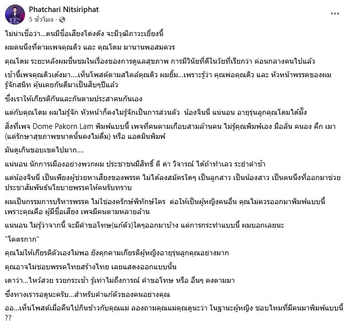 สิ่งที่เพจ Dome Pakorn Lam พิมพ์แบบนี้ เพจที่คนตามเกือบสามล้านคน ไม่รู้คุณพิมพ์เอง มือลั่น คนอง คึก เมา (แต่รักษาสุขภาพขนาดนั้นคงไม่ดื่ม) หรือ แอดมินพิมพ์ มันดูเกินขอบเขตไปมาก แน่นอน นักการเมืองอย่างพวกผม ประชาชนมีสิทธิ์ ติ ด่า วิจารณ์ ได้ถ้าทำเลว ระยำตำช้า