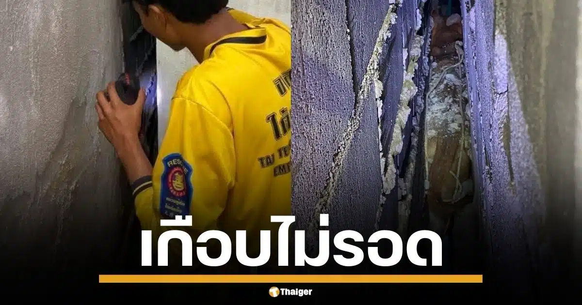 เจ้าตูบผวาพลุปีใหม่ วิ่งหนีมุดซอกตึก ร้องระงมหวิดสิ้นใจ กู้ภัยระดมเจาะปูนช่วยสำเร็จ