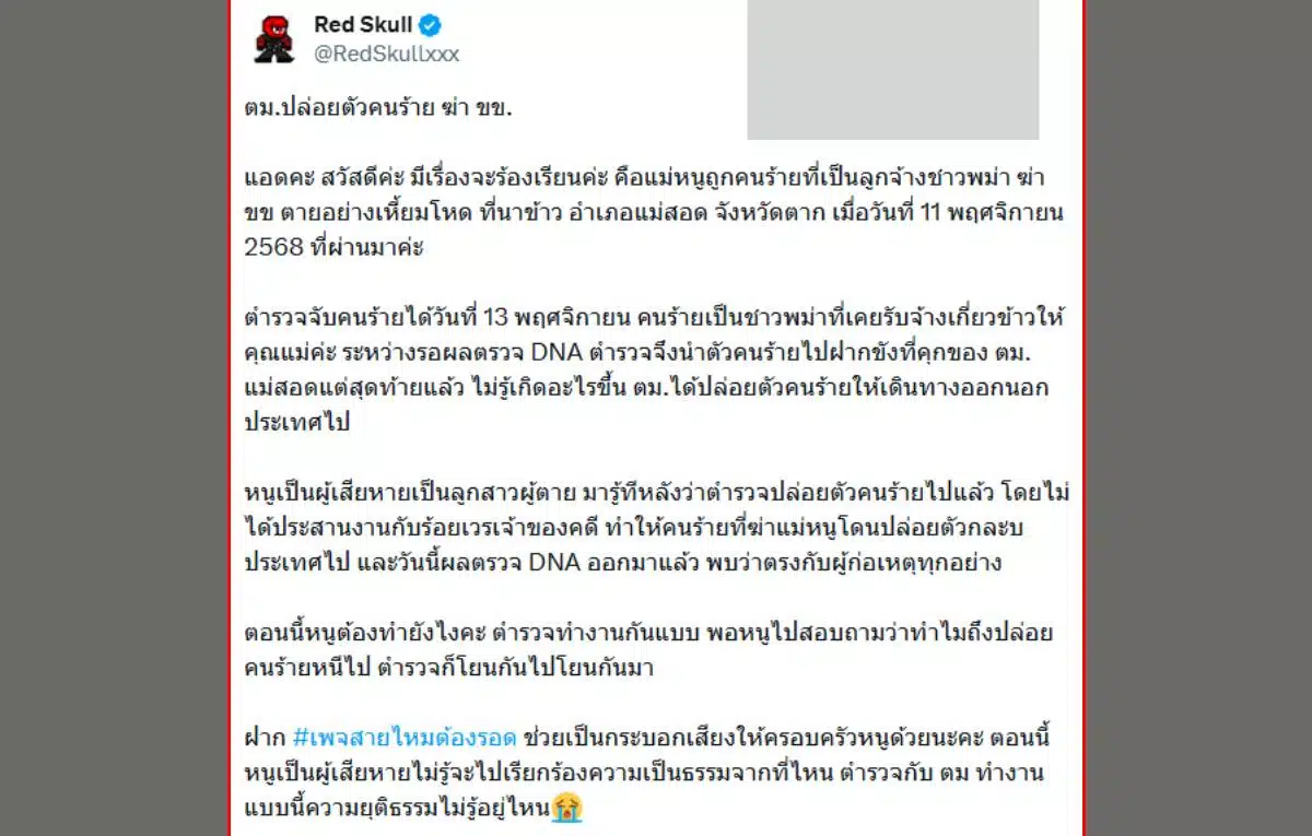 ลูกสาวสุดช้ำขอเพจสายไหมต้องรอด เข้ามาช่วยเหลือด่วน ! หลังตำรวจและ ตม. แม่สอด ปล่อยตัวผู้ต้องหาชาวเมียนมากลับประเทศ ทั้งที่เป็นคนลงมือฆาตกรรมมารดาของตัวเองอย่างเหี้ยมโหด