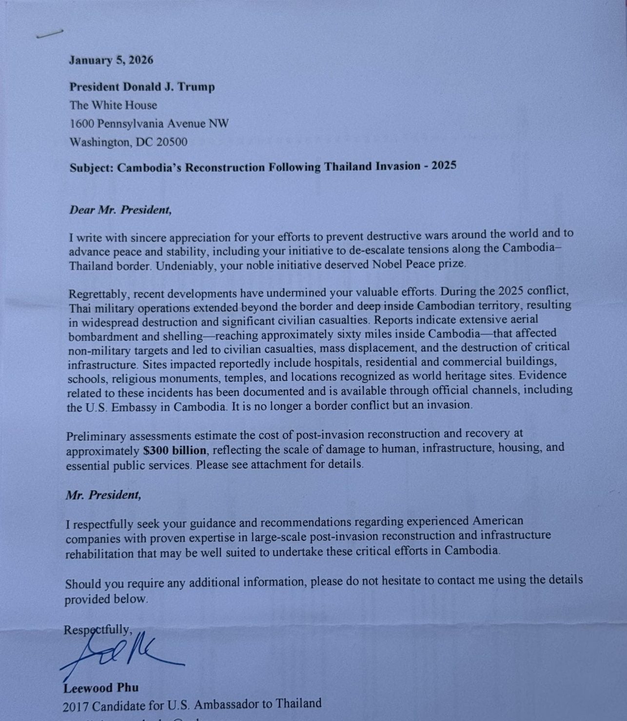 ข้าพเจ้าขอเขียนจดหมายฉบับนี้เพื่อแสดงความชื่นชมอย่างจริงใจต่อความพยายามของท่านในการป้องกันสงครามอันก่อให้เกิดความสูญเสียทั่วโลก และในการส่งเสริมสันติภาพและเสถียรภาพระหว่างประเทศ รวมถึงความริเริ่มของท่านในการลดระดับความตึงเครียดตามแนวชายแดนกัมพูชา–ไทย ซึ่งไม่อาจปฏิเสธได้เลยว่าความริเริ่มอันทรงคุณค่านี้ของท่านสมควรได้รับการยกย่องในระดับรางวัลโนเบลสาขาสันติภาพ
