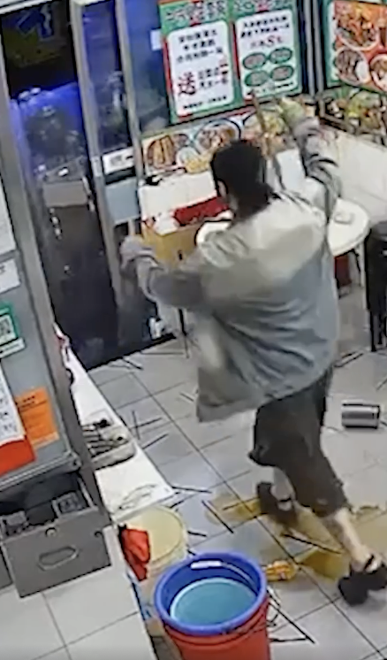 ความโกรธเกรี้ยวทวีความรุนแรงขึ้น เธอคว้า มีดทำครัวความยาวกว่า 30 เซนติเมตร ขึ้นมาข่มขู่พนักงานในร้าน ก่อนจะอาละวาดทำลายข้าวของจนถ้วยชามกระจัดกระจายเกลื่อนพื้น และทุบทำลายโทรศัพท์มือถือในร้านจนพังเสียหาย