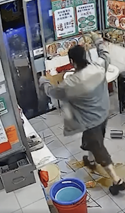ความโกรธเกรี้ยวทวีความรุนแรงขึ้น เธอคว้า มีดทำครัวความยาวกว่า 30 เซนติเมตร ขึ้นมาข่มขู่พนักงานในร้าน ก่อนจะอาละวาดทำลายข้าวของจนถ้วยชามกระจัดกระจายเกลื่อนพื้น และทุบทำลายโทรศัพท์มือถือในร้านจนพังเสียหาย