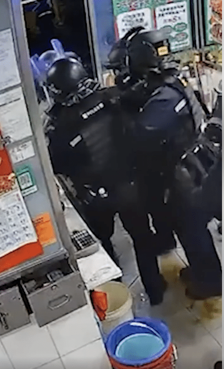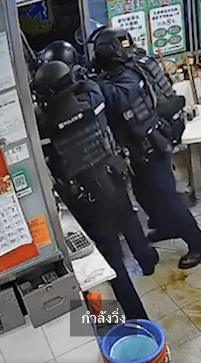 เมื่อเจ้าหน้าที่ตำรวจพร้อมอุปกรณ์ป้องกันตัว ทั้งหมวกนิรภัยและโล่ เดินทางมาถึงจุดเกิดเหตุ สถานการณ์กลับตึงเครียดยิ่งขึ้น ภาพจากคลิปวิดีโอเผยให้เห็นวินาทีที่หญิงสาวสวมหน้ากากดำ ถือมีดปังตอและกรรไกรในมือ เดินรี่เข้าหาตำรวจที่ตรึงกำลังอยู่หน้าร้าน