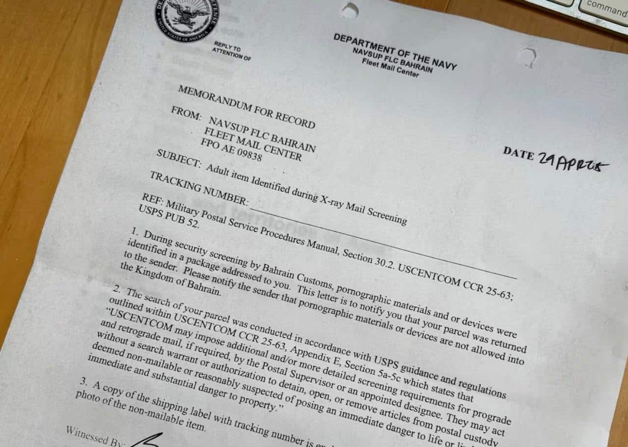 ก่อนที่หลายวันต่อมา ทางร้านจะได้รับกล่องสินค้ากลับมาที่โกดังคืนและพบว่ากล่องดังกล่าวถูกเปิดออก เมื่อตรวจสอบก็พบว่าเป็นจดหมายจากกองทัพเรือสหรัฐฯ เขียนข้อความว่า “ระหว่างการตรวจสอบความปลอดภัยโดยศุลกากรบาห์เรน พบสื่อลามกหรืออุปกรณ์ลามกอนาจารในพัสดุที่ส่งถึงคุณ จดหมายฉบับนี้มีวัตถุประสงค์เพื่อแจ้งให้คุณทราบว่าพัสดุของคุณถูกส่งคืนไปยังผู้ส่งแล้ว โปรดแจ้งผู้ส่งว่า สื่อลามกหรืออุปกรณ์ลามกอนาจารไม่ได้รับอนุญาตให้นำเข้าสู่ราชอาณาจักรบาห์เรน”