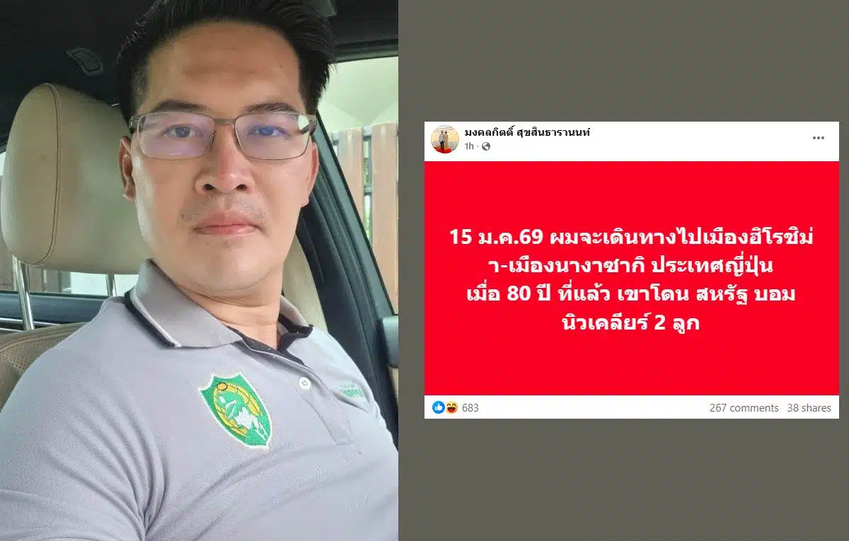 “15 ม.ค.69 ผมจะเดินทางไปเมืองฮิโรชิม่า-เมืองนางาซากิ ประเทศญี่ปุ่นเมื่อ 80 ปี ที่แล้ว เขาโดน สหรัฐ บอม นิวเคลียร์ 2 ลูก”