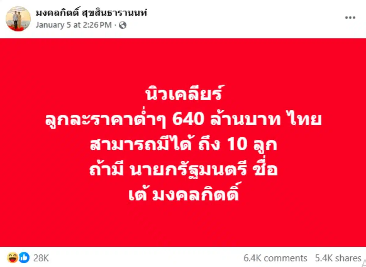 กลายเป็นไวรัลทันทีเมื่อ นายมงคลกิตติ์ สุขสินธารานนท์ หรือ “เต้ พระราม 7” จากพรรคทางเลือกใหม่ ออกมาประกาศนโยบายความมั่นคงสุดโต่ง โดยชูแนวคิดว่าประเทศไทยต้องมี “อาวุธนิวเคลียร์” จำนวน 10 ลูก งบ 6.4 พันล้านบาท หากเขาได้ก้าวขึ้นเป็นนายกรัฐมนตรี