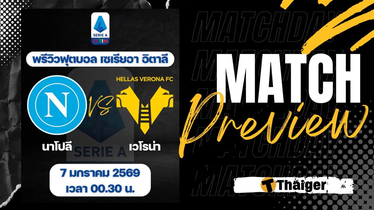 7 มกราคม 2569 เวลา 00.30 น. ถ่ายทอดสด ดูบอลสด ฟุตบอล กัลโช่ เซเรียอา อิตาลี ฤดูกาล 2025/26 ที่สนาม สตาดิโอ ดิเอโก้ อาร์มันโด้ มาราโดน่า นาโปลี พบ เวโรน่า The Thaiger พาไปวิเคราะห์เกม พร้อมการทำนายผล และคาดการณ์ 11 ตัวจริงได้ที่นี่