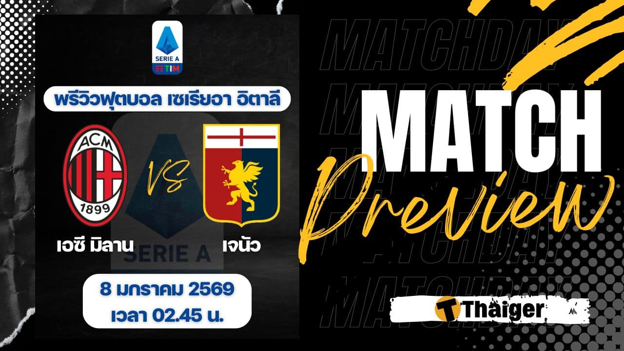 8 มกราคม 2569 เวลา 02.45 น. ถ่ายทอดสด ดูบอลสด ฟุตบอล กัลโช่ เซเรียอา อิตาลี ฤดูกาล 2025/26 ที่สนาม ซาน ซิโร่ เอซี มิลาน พบ เจนัว The Thaiger พาไปวิเคราะห์เกม พร้อมการทำนายผล และคาดการณ์ 11 ตัวจริงได้ที่นี่