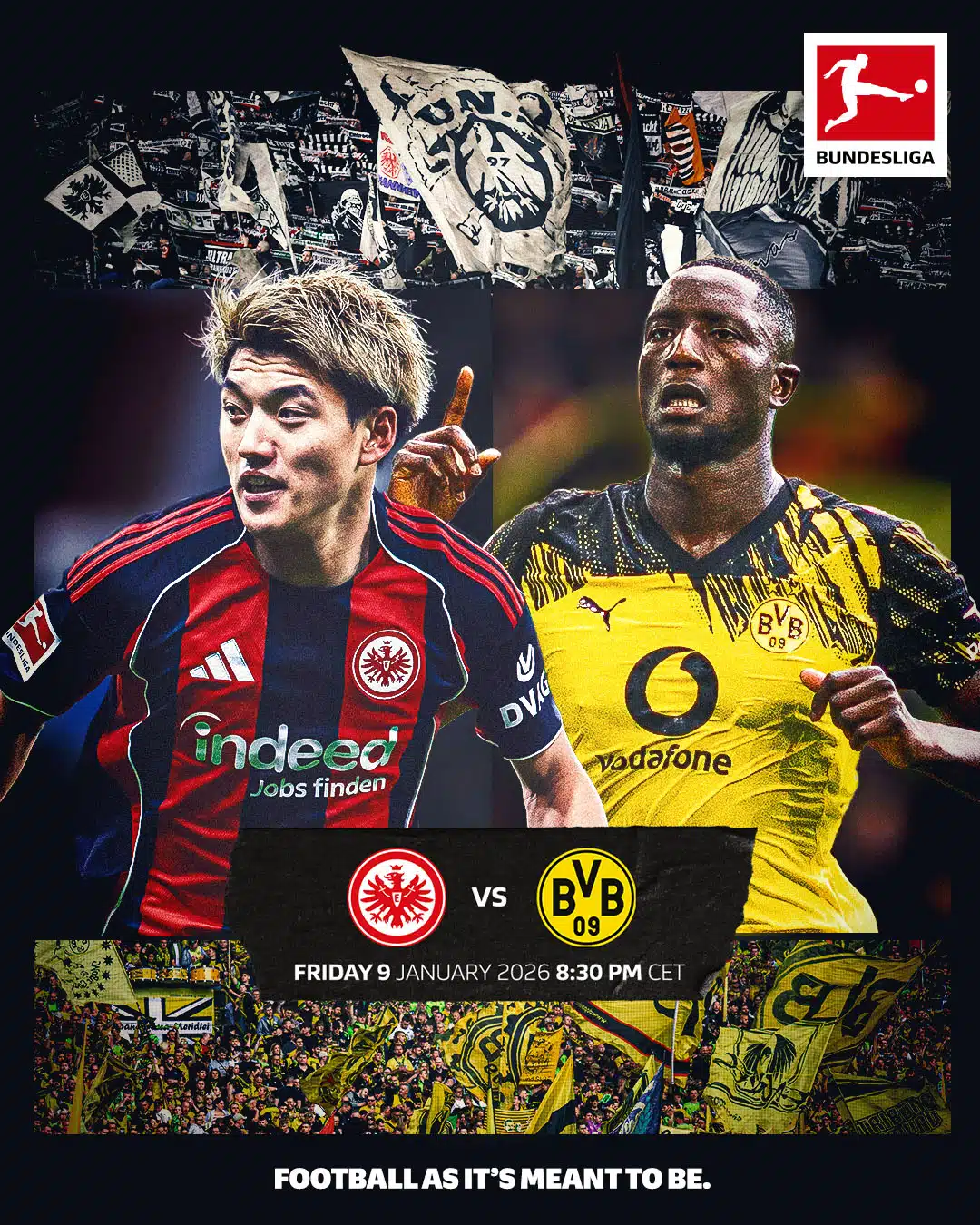 9 มกราคม 2569 เวลา 02.30 น. ถ่ายทอดสด ดูบอลสด ฟุตบอล บุนเดสลีกา ฤดูกาล 2025/26 ที่สนาม ดอยช์ แบงค์ พาร์ค แฟร้งค์เฟิร์ต พบ ดอร์ทมุนด์ The Thaiger พาไปวิเคราะห์เกม พร้อมการทำนายผล และคาดการณ์ 11 ตัวจริงได้ที่นี่