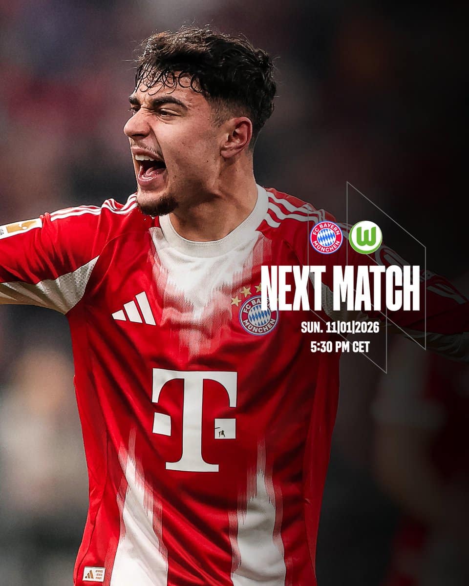 11 มกราคม 2569 เวลา 23.30 น. ถ่ายทอดสด ดูบอลสด ฟุตบอล บุนเดสลีกา ฤดูกาล 2025/26 ที่สนาม อัลลิอันซ์ อารีน่า บาเยิร์น มิวนิค พบ โวล์ฟสบวร์ก The Thaiger พาไปวิเคราะห์เกม พร้อมการทำนายผล และคาดการณ์ 11 ตัวจริงได้ที่นี่