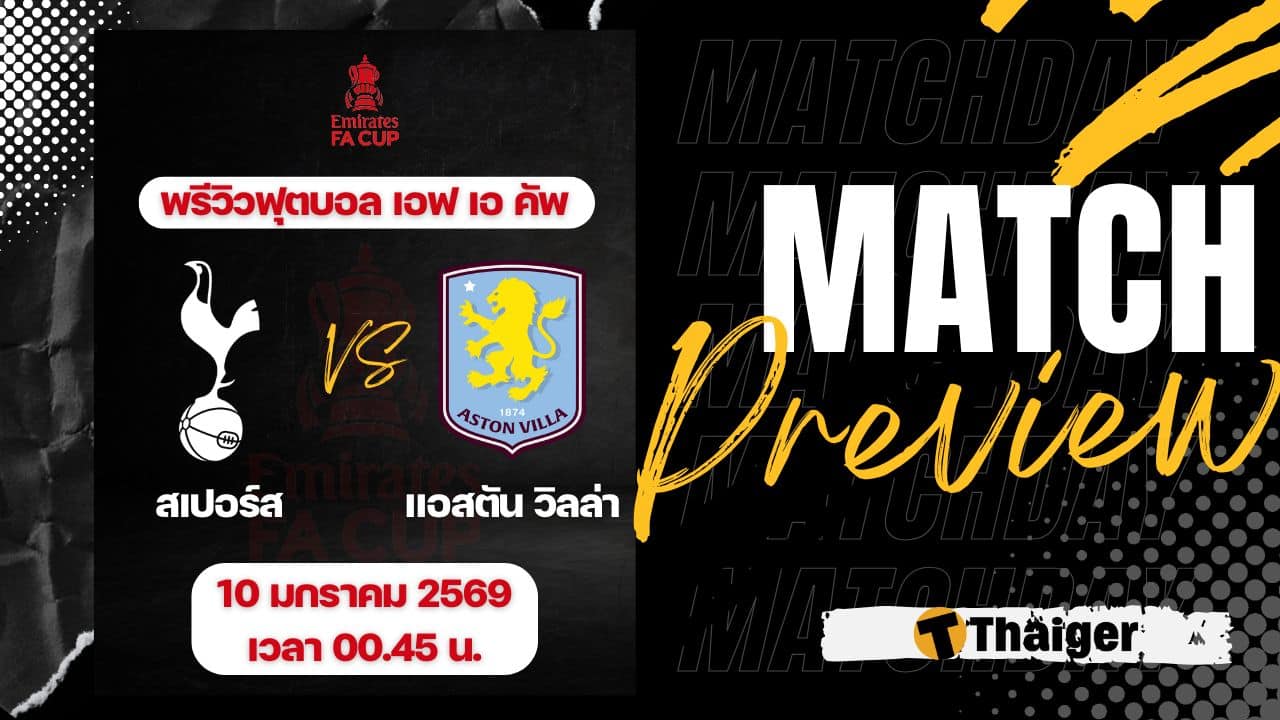 10 มกราคม 2569 เวลา 00.45 น. ถ่ายทอดสด ดูบอลสด ฟุตบอล เอฟเอ คัพ ฤดูกาล 2025/26 รอบ 3 ที่สนาม ท็อตแน่ม ฮอตสเปอร์ สเตเดี้ยม สเปอร์ส พบ แอสตัน วิลล่า The Thaiger พาไปวิเคราะห์เกม พร้อมการทำนายผล และคาดการณ์ 11 ตัวจริงได้ที่นี่