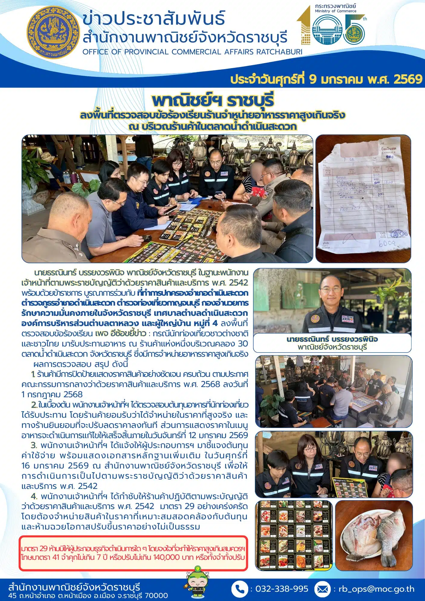 ล่าสุดเมื่อวันที่ 9 ม.ค. 69 นายธรณินทร์ บรรยงวรพินิจ พาณิชย์จังหวัดราชบุรี แท็กทีมกับ พ.ต.อ.ภูภณ ทัพเจริญ ผกก.สภ.ดำเนินสะดวก นำกำลังเจ้าหน้าที่และฝ่ายปกครอง ล่องเรือบุกเข้าไปตรวจเช็กที่เกิดเหตุ พบว่าเป็นร้านอาหารริมคลองที่นักท่องเที่ยวต้องนั่งเรือเข้าไปถึงจะได้กิน ซึ่งภายในร้านมีการติดป้ายราคาไว้จริง แต่ตัวเลขนั้นทำเอาเจ้าหน้าที่ถึงกับกุมขมับ