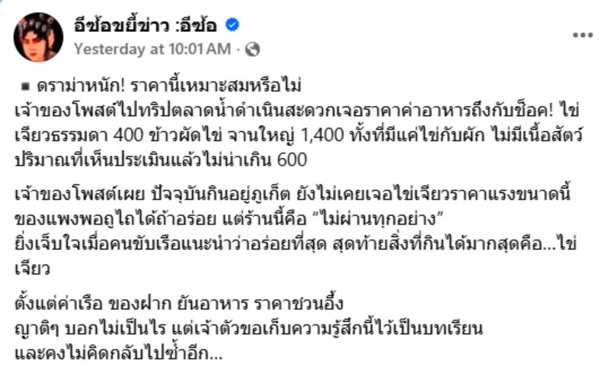 แฉเบื้องหลังไข่เจียวจาน 400 – ข้าวผัด 1,400 เจ้าของร้านโอด “ค่าหัวเรือ 900” ทำต้นทุนพุ่ง
