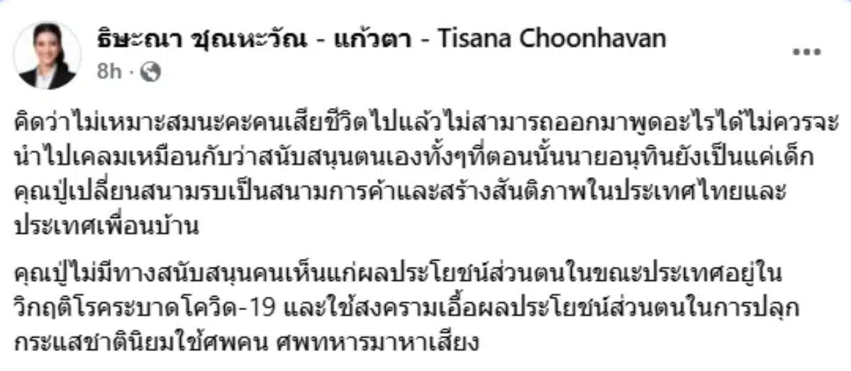 ธิษะณา ชุณหะวัณ อดีต สส.กทม.พรรคประชาชน โต้ไวรัลภาพวันเด็ก อนุทินร่วมเฟรมวัยเยาว์กับ พลเอก ชาติชาย อดีตนายกรัฐมนตรีคนที่ 17 มองไม่เหมาะสม ยันปู่ไม่มีทางหนุนคนเห็นแก่ผลประโยชน์ตอนประเทศอยู่ในวิกฤติโรคระบาดโควิด-19