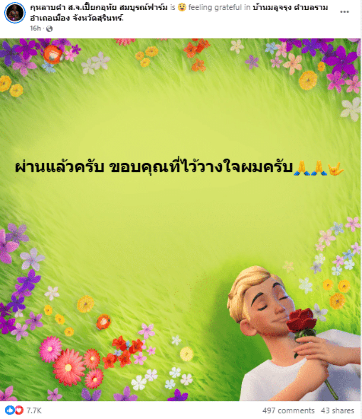 หลังทราบผลคะแนนอย่างไม่เป็นทางการ กุหลาบดำ ซึ่งปัจจุบันสังกัดค่ายใหญ่อย่าง PK. แสนชัย ได้เคลื่อนไหวผ่านโซเชียลมีเดียด้วยข้อความสั้นๆ แต่แฝงด้วยความมุ่งมั่นว่า “ผ่านแล้วครับ ขอบคุณที่ไว้วางใจผมครับ”