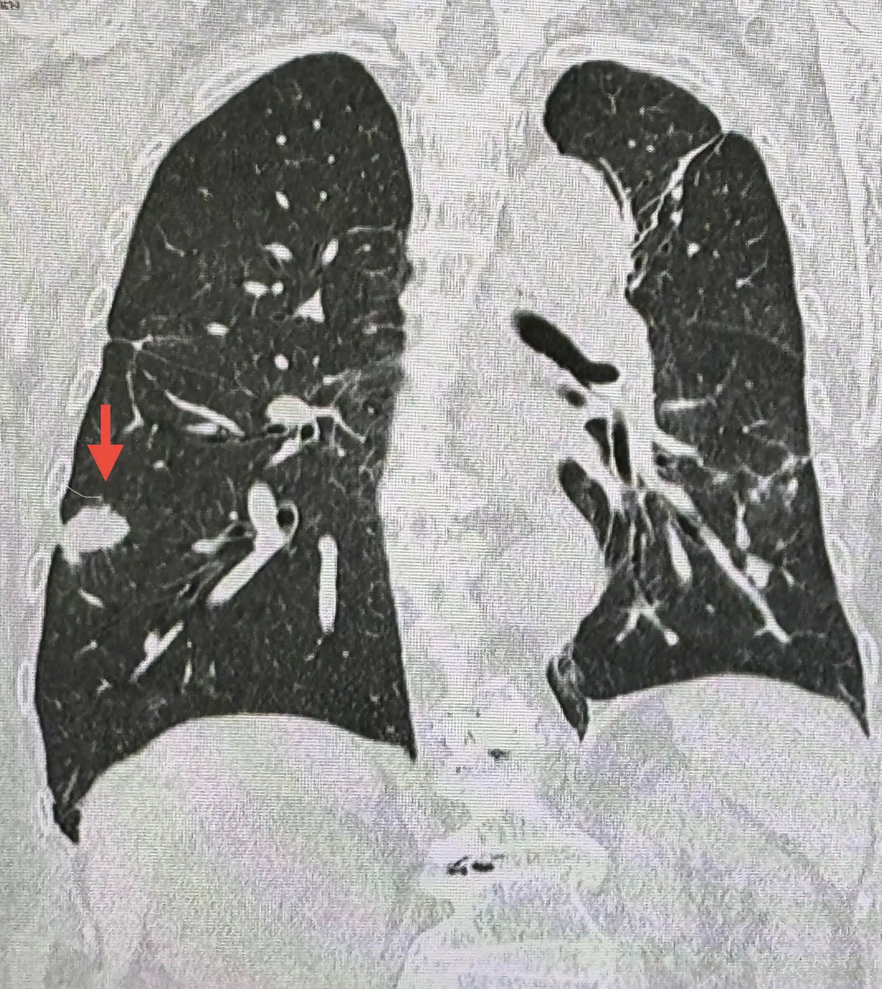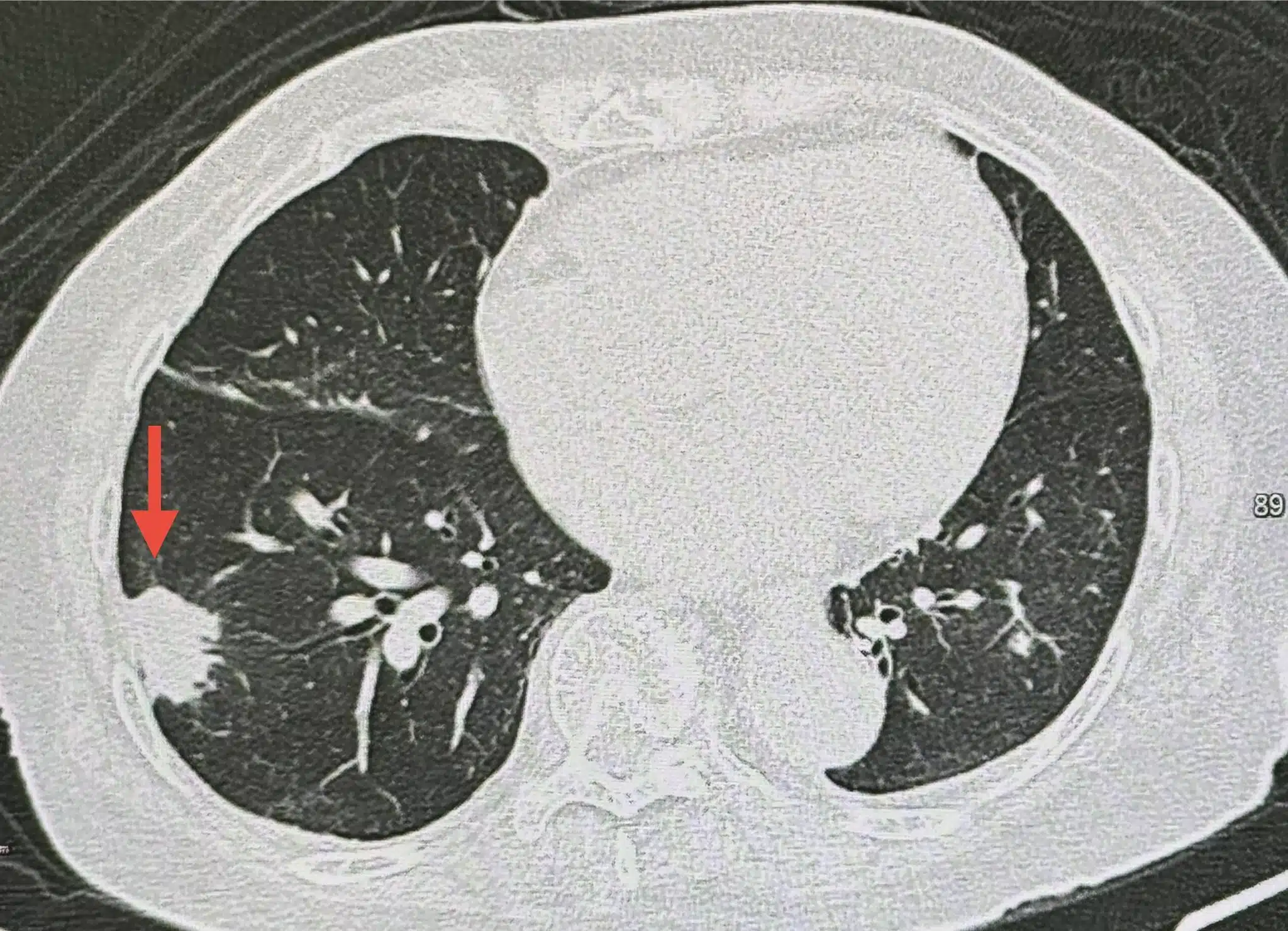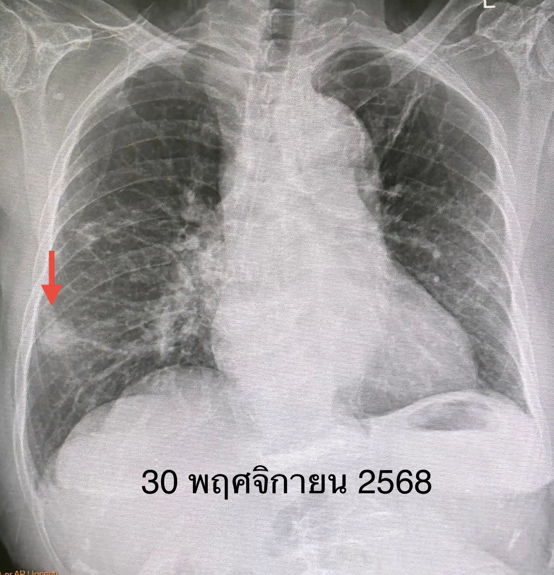 แต่ผลการตรวจทางแพทย์กลับพบความผิดปกติ ซึ่งภาพเอกซเรย์ปอด พบเงาผิดปกติที่ปอดข้างขวาด้านบน (รอยโรคเดิมจากวัณโรค) แต่สิ่งที่น่ากังวลคือ พบก้อนเนื้อใหม่ขนาด 1.9 x 1.9 เซนติเมตร ที่ปอดข้างขวาด้านล่าง ปีก่อนหน้านี้ไม่เคยมี จากเอกซเรย์คอมพิวเตอร์ (CT Scan) พบก้อนขนาดใหญ่ขึ้นเป็น 3.0 × 2.4 × 2.0 เซนติเมตรที่ปอดขวาด้านล่าง ส่วนผลเลือดค่าบ่งชี้มะเร็งทุกตัวปกติ