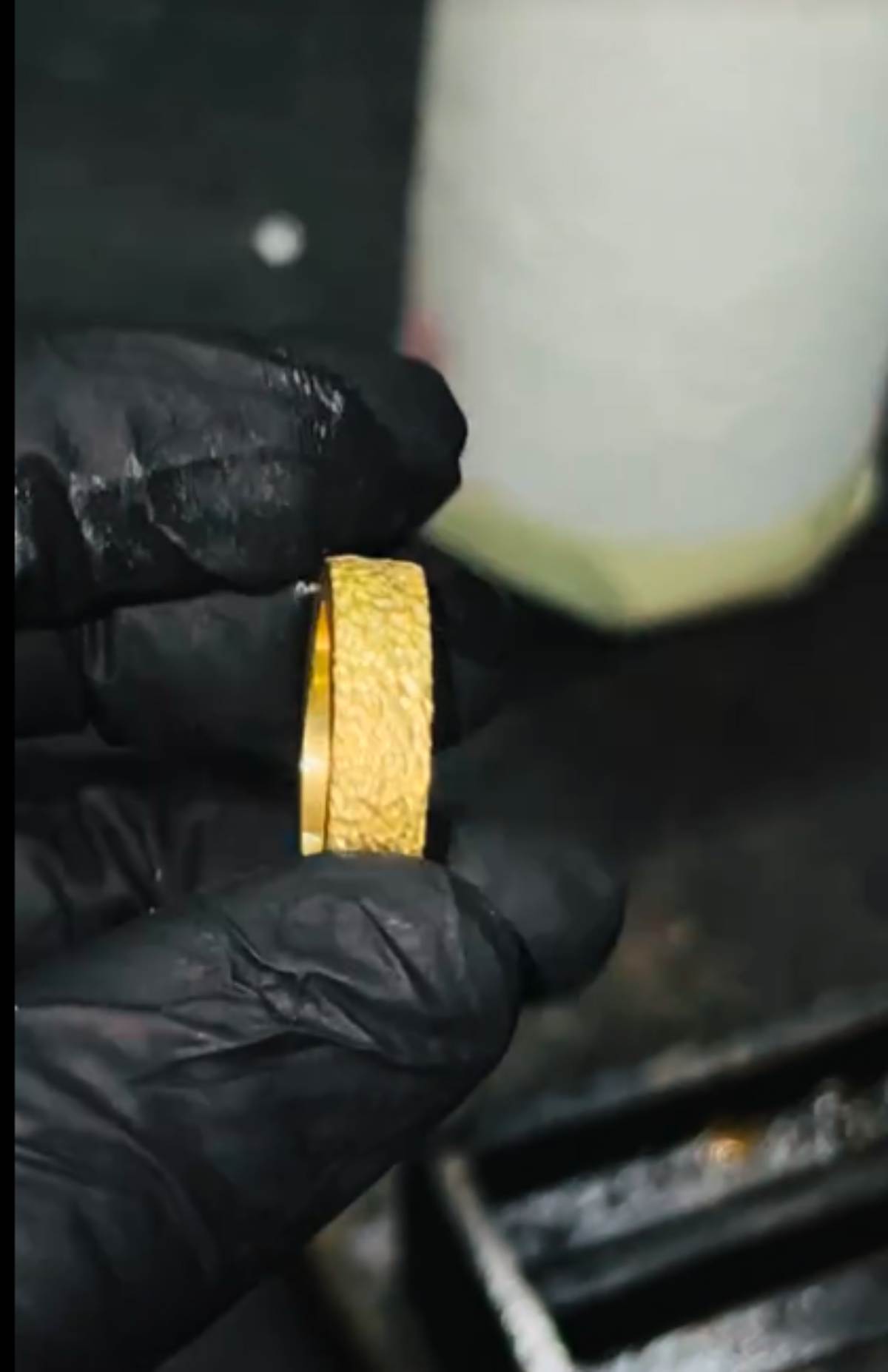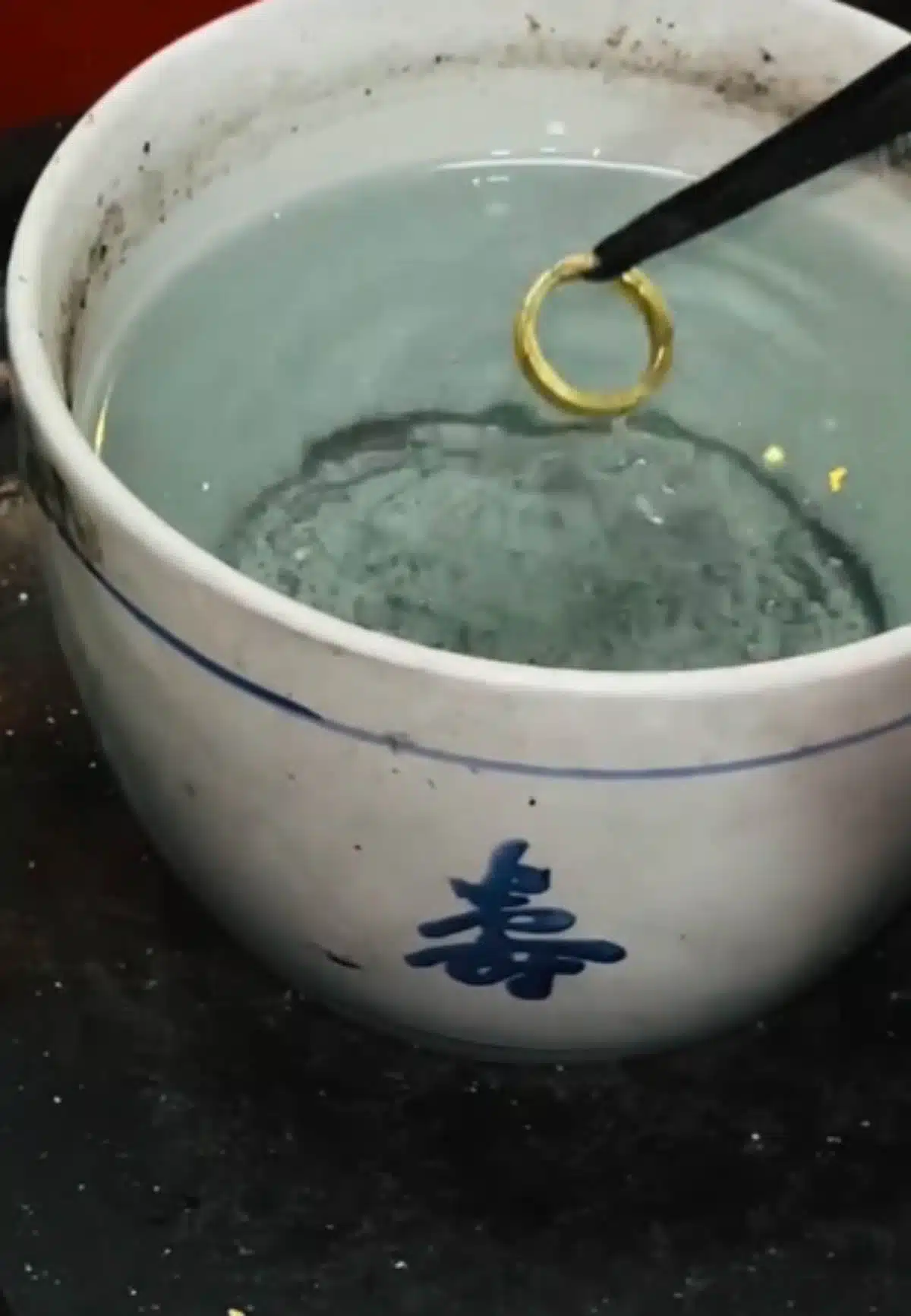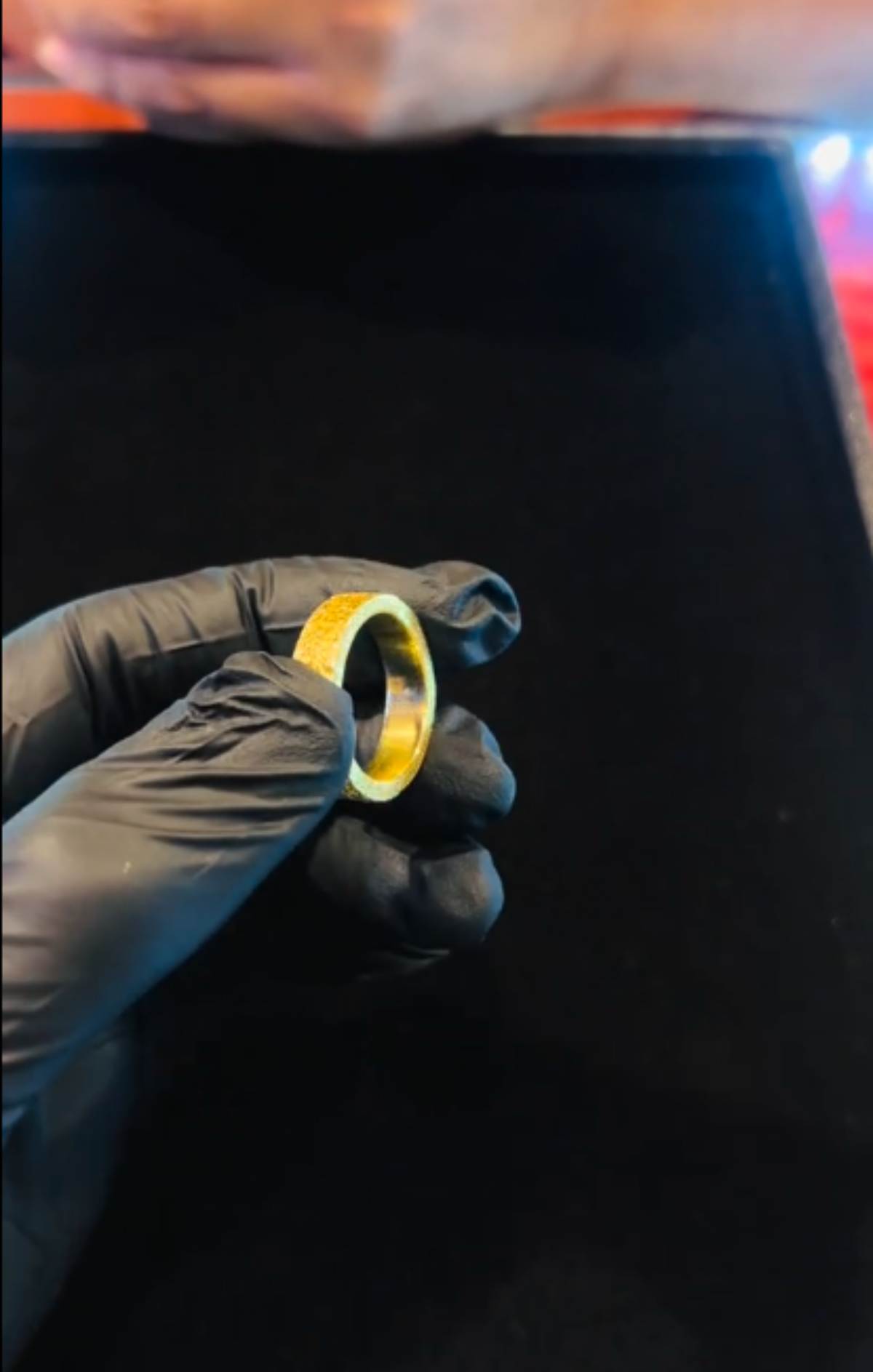 นอกจากนี้ เมื่อทดสอบด้วยการเป่าไฟตามมาตรฐานการตรวจทอง ผิวของแหวนกลับเปลี่ยนเป็นสีหมองคล้ำอมเขียวและขาว ซึ่งไม่ใช่ลักษณะของทองคำมาตรฐานที่จะต้องคงความเหลืองอร่าม และเมื่อตรวจสอบเนื้อในพบค่าทองบางจุดต่ำลงเหลือเพียง 62.98% เท่านั้น