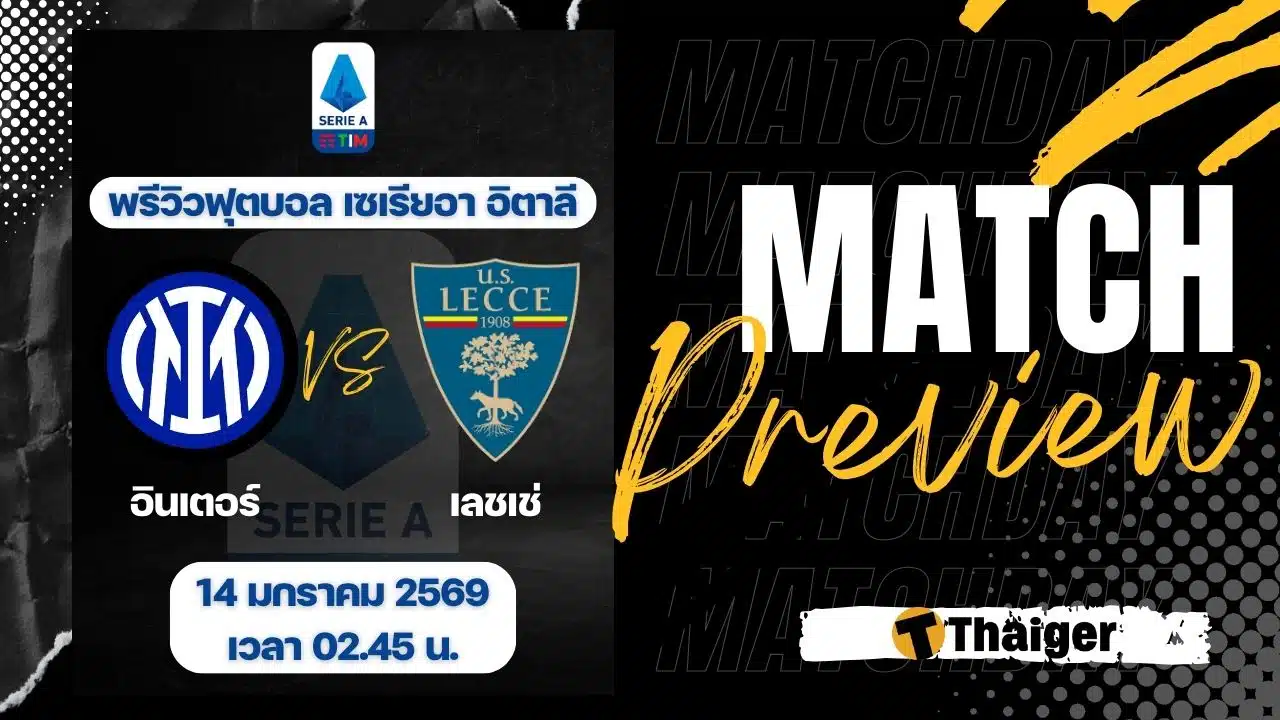 14 มกราคม 2569 เวลา 02.45 น. ถ่ายทอดสด ดูบอลสด ฟุตบอล กัลโช่ เซเรียอา อิตาลี ฤดูกาล 2025/26 ที่สนาม จูเซ็ปเป้ เมอัซซ่า อินเตอร์ มิลาน พบ เลชเช่ The Thaiger พาไปวิเคราะห์เกม พร้อมการทำนายผล และคาดการณ์ 11 ตัวจริงได้ที่นี่