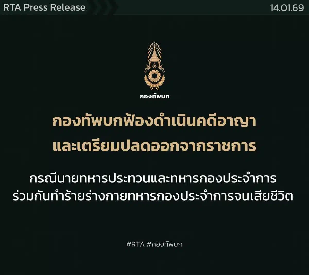 กองทัพบกขอเรียนว่า กรณีดังกล่าวถือเป็นการกระทำผิดวินัยทหารอย่างร้ายแรง และเป็นการกระทำผิดกฎหมายอาญา ทั้งยังเป็นการละเมิดนโยบายของกองทัพอย่างไม่อาจยอมรับได้ ซึ่งสร้างความเสื่อมเสียต่อกองทัพบกเป็นอย่างยิ่ง