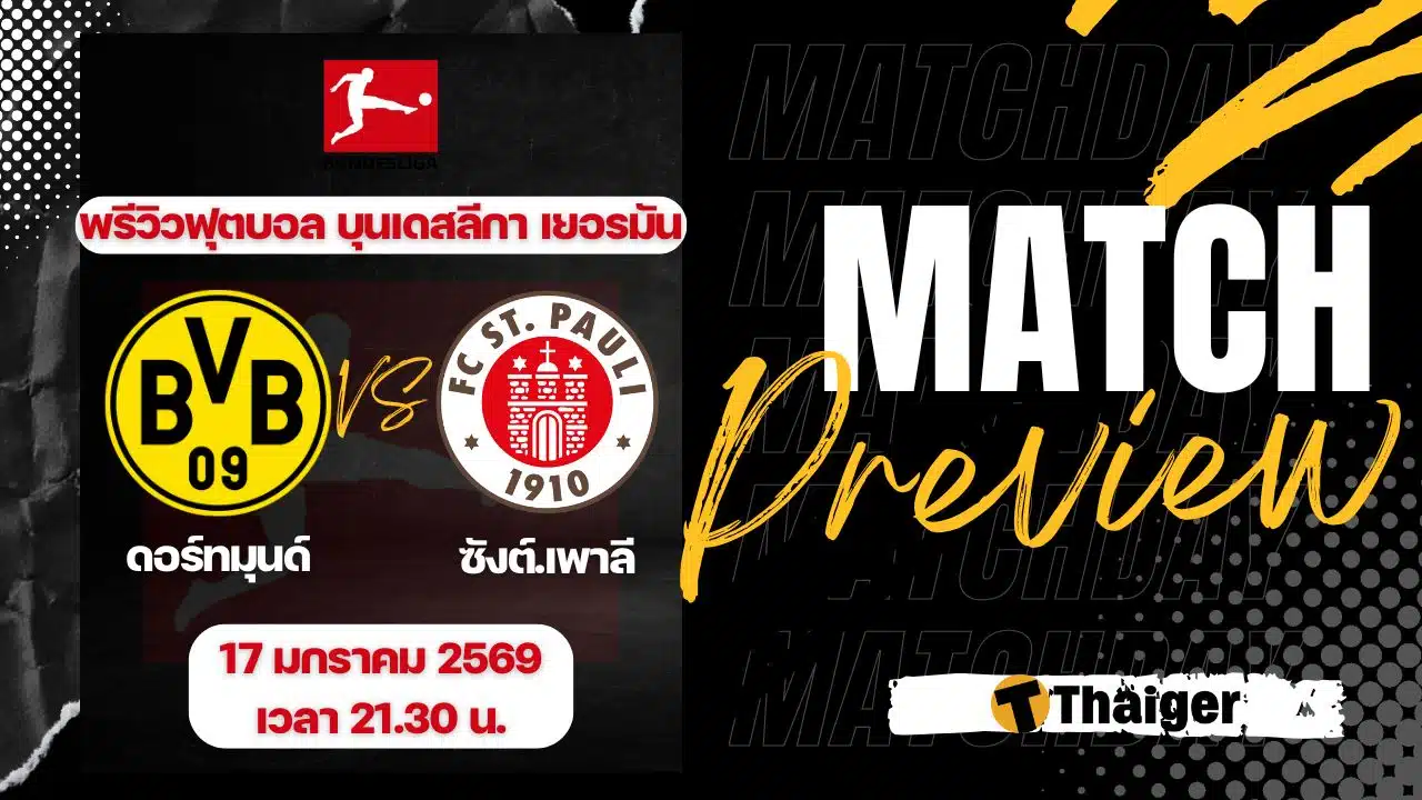 17 มกราคม 2569 เวลา 21.30 น. ถ่ายทอดสด ดูบอลสด ฟุตบอล บุนเดสลีกา ฤดูกาล 2025/26 ที่สนาม ซิกนัล อิดูน่า พาร์ค ดอร์ทมุนด์ พบ ซังต์.เพาลี The Thaiger พาไปวิเคราะห์เกม พร้อมการทำนายผล และคาดการณ์ 11 ตัวจริงได้ที่นี่