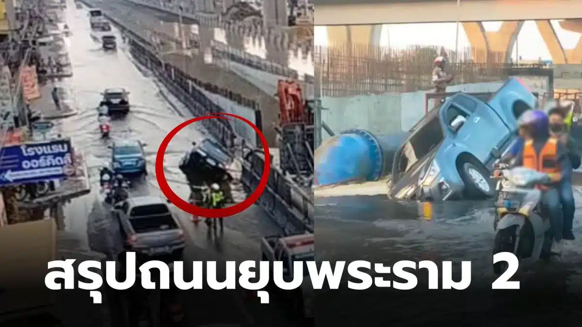 วุ่นหนัก! ถนนพระราม 2 ยุบตัว ใกล้จุุดเครนถล่ม กระบะหัวทิ่มตกหลุม-จราจรติดขัด